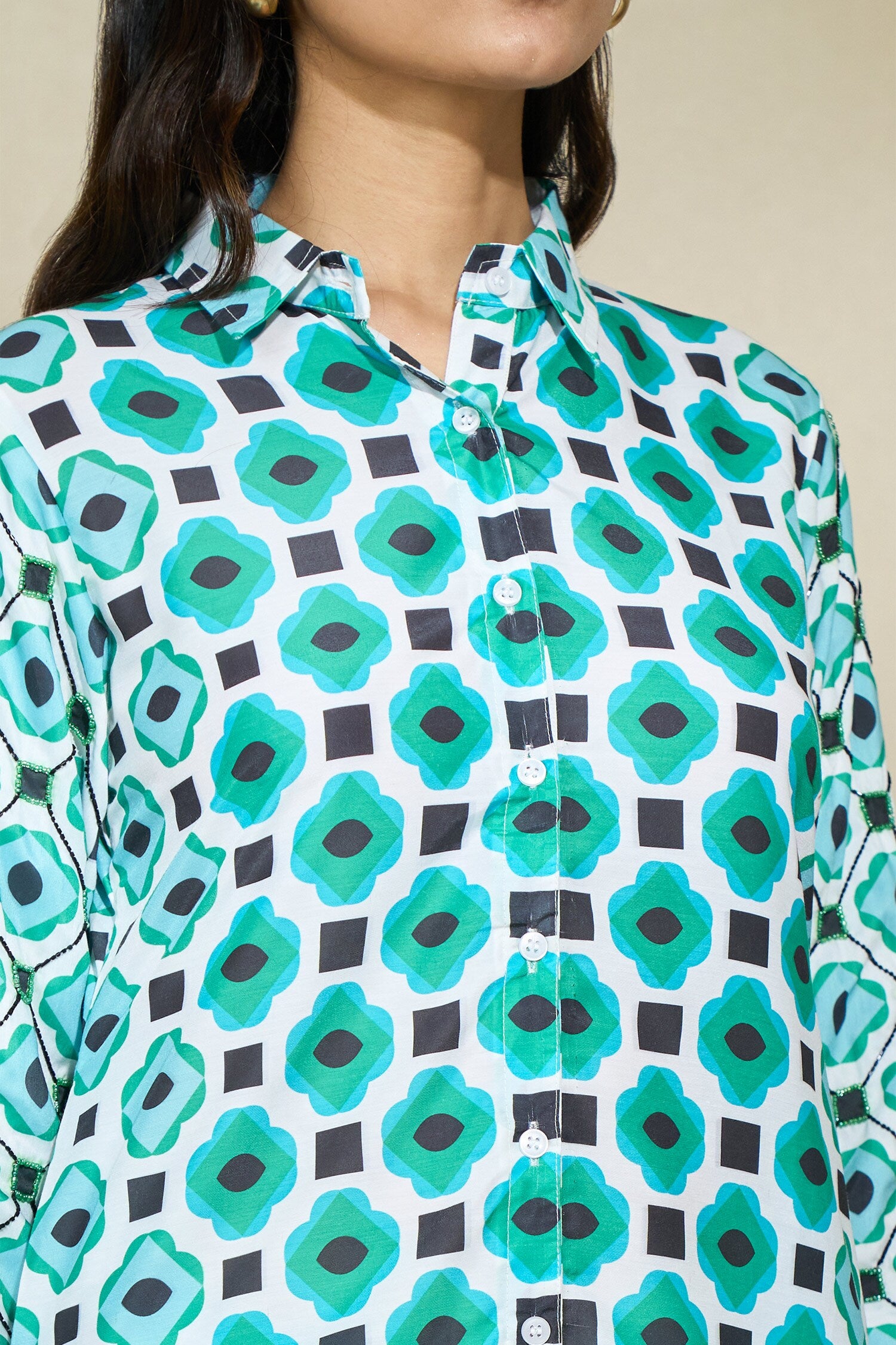 THE SLEEVES ARE FULLY HIGHLIGHTED WITH AFRICAN BEAD HAND WORK IN BLACK & GREEN.