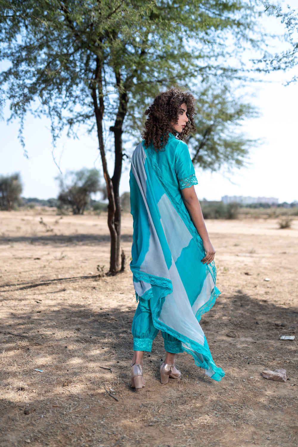 KURTA – SLEEVE EDGED WITH SAME TONE AQUA GREEN LACE.