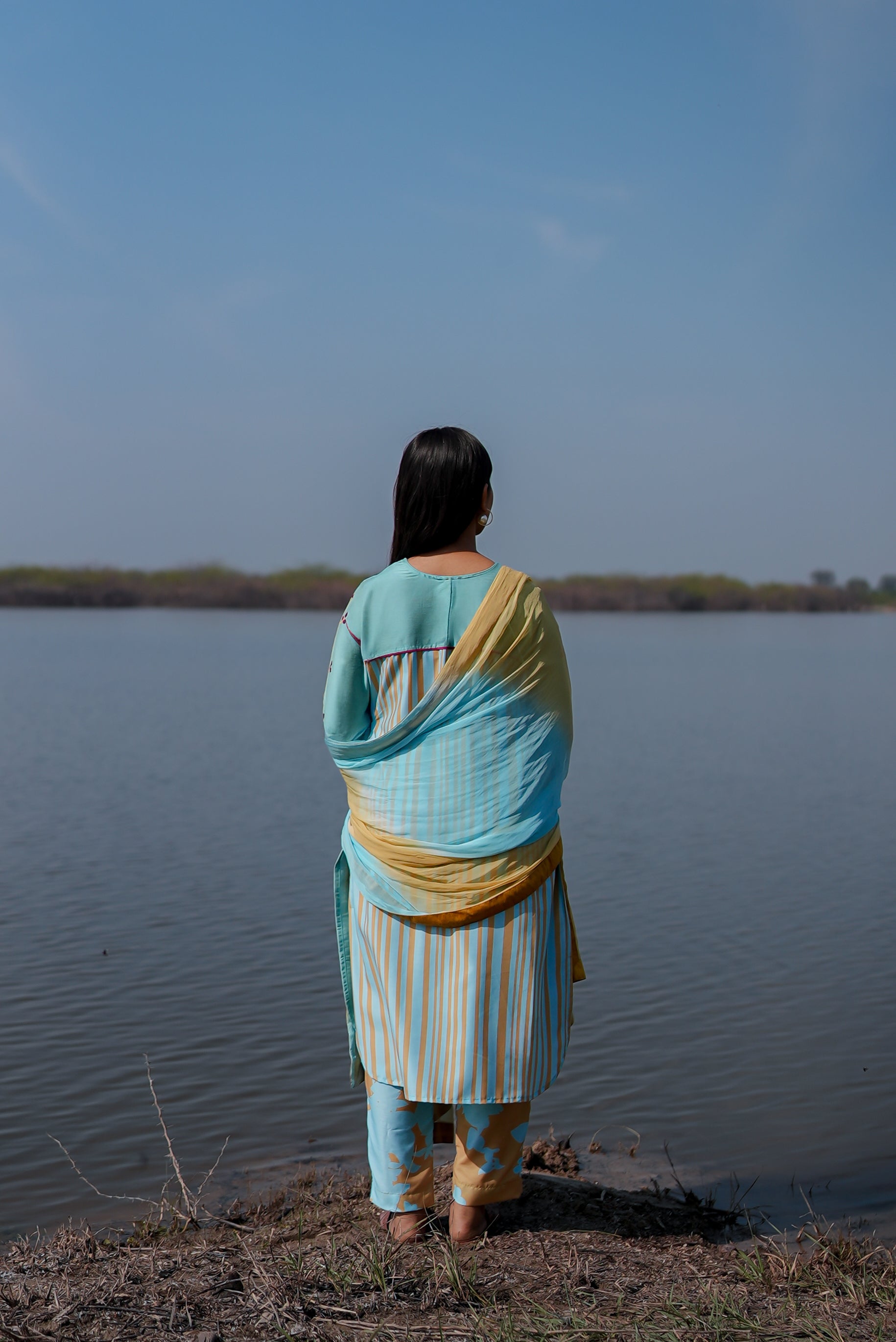 KURTA - (FRONT) PURE JAAM COTTON WITH HAND EMBROIDERY ; (BACK) STRIPED PURE JAAM COTTON MUSLIN