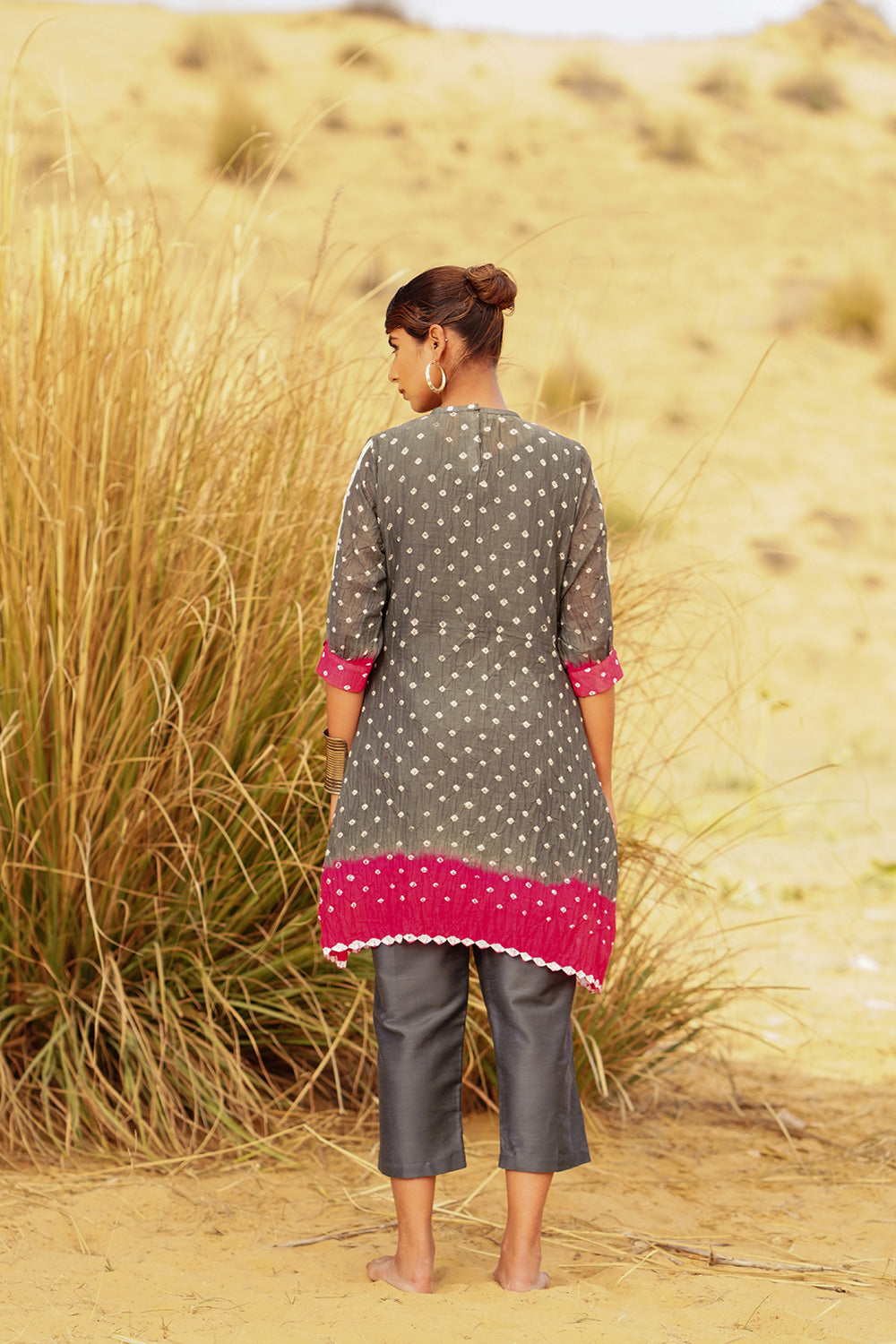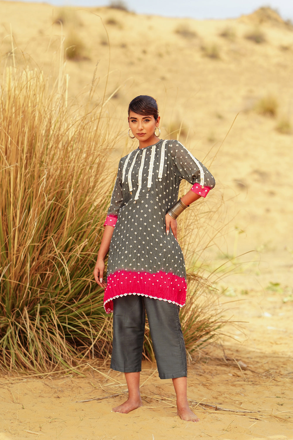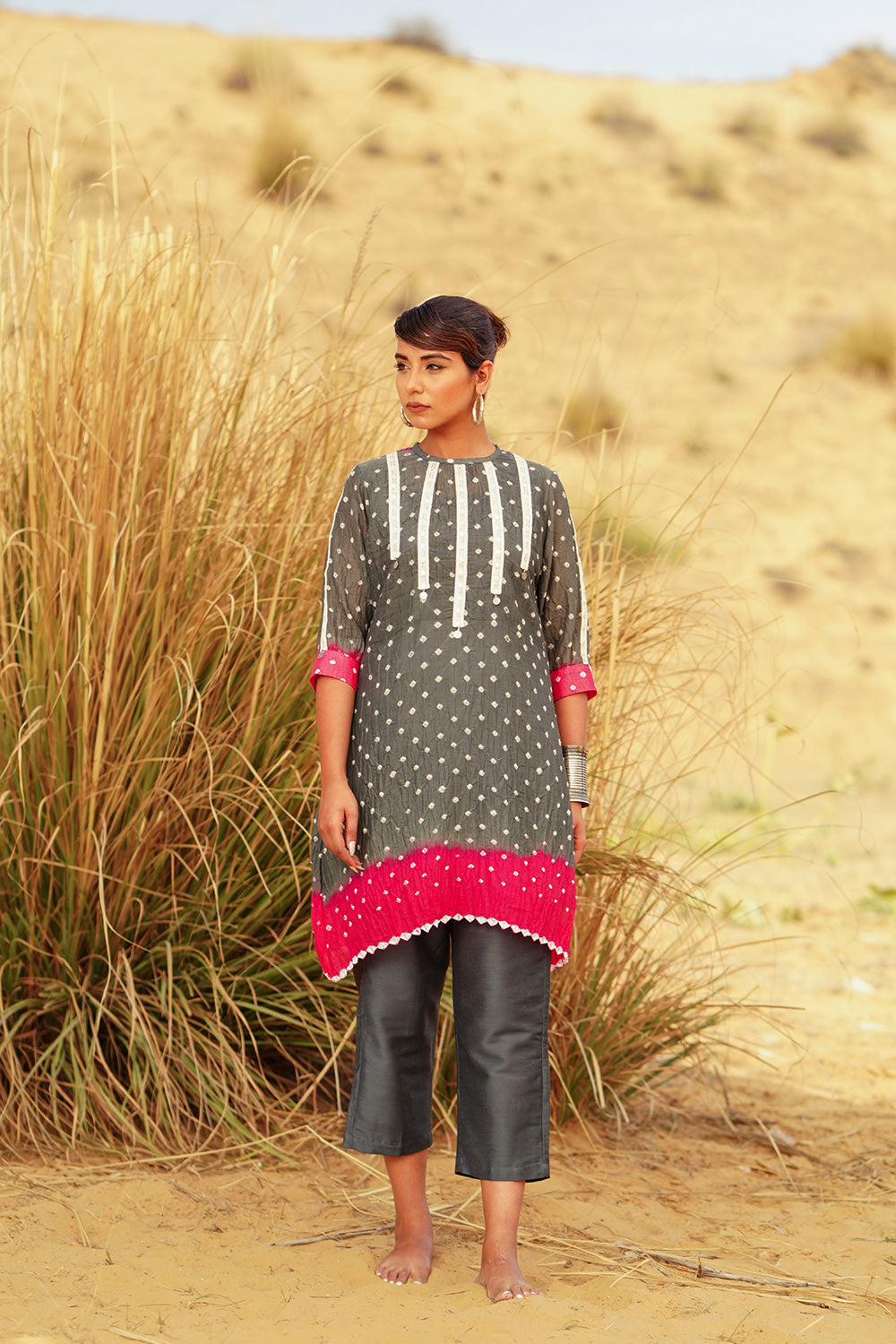 THIS IS A 3 PIECE SET – AN ‘A’ LINE TOP WITH BOHEMIAN DETAILING OF MIRROR & SILVER EMBELLISHMENTS. A COTTON LINING SLIP. JAAM COTTON PANTS.