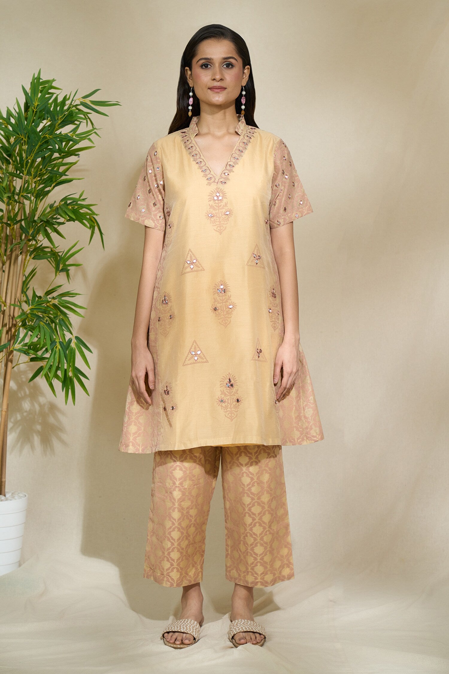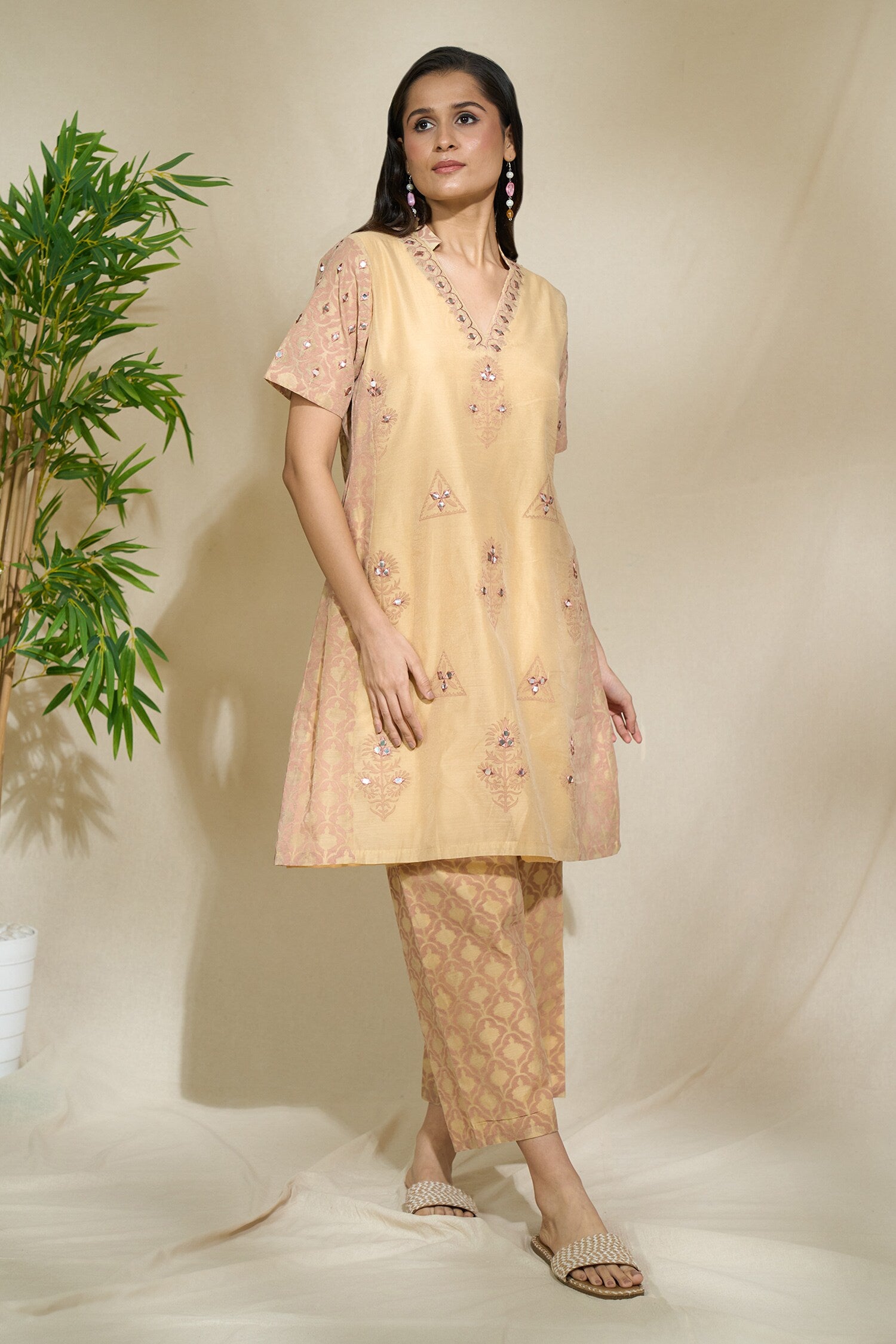 A SET OF 3, THIS OUTFIT IS CRAFTED IN SOFT, FLOWY, PURE COTTON CHANDERI IN CHAMPEGNE BEIGE.