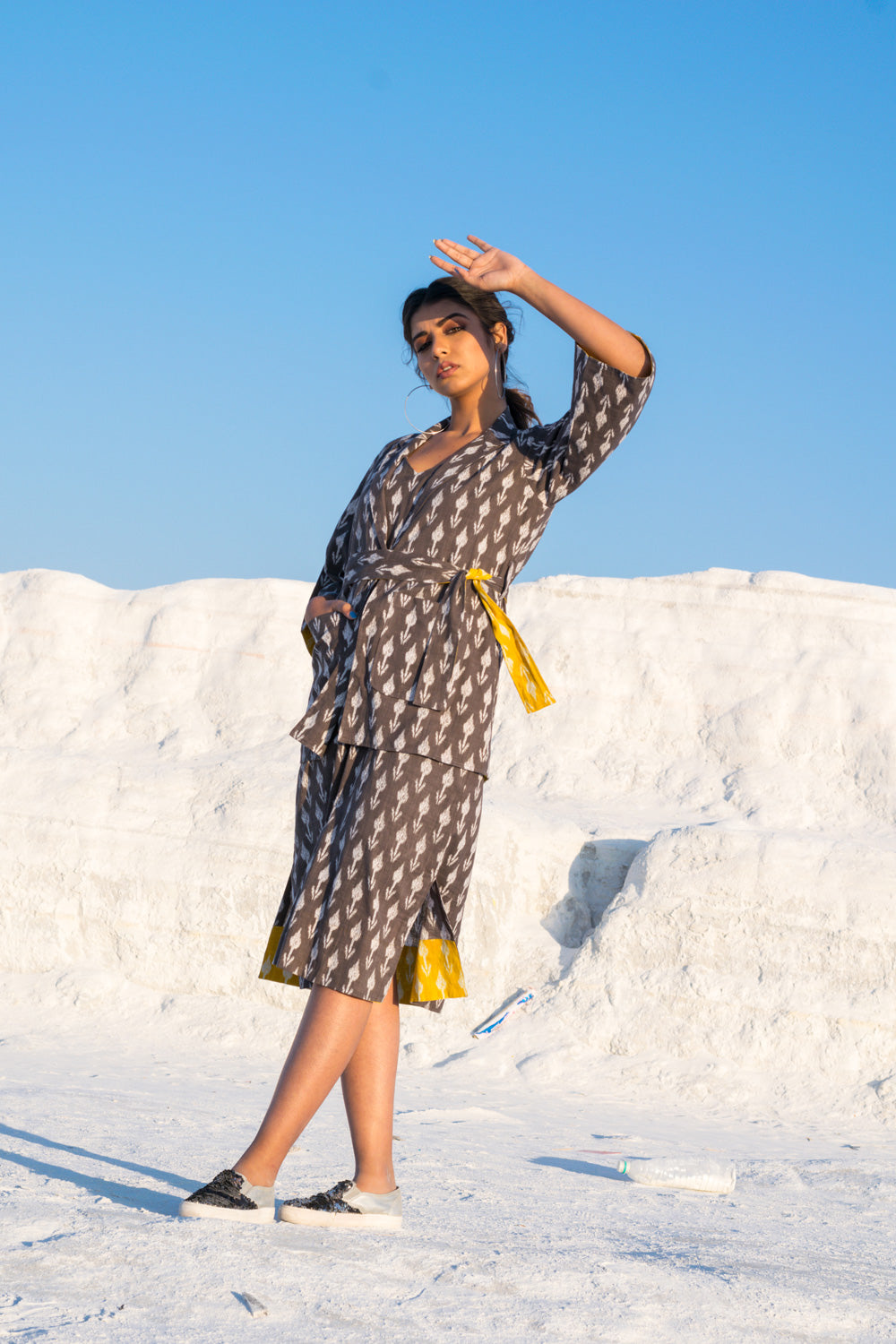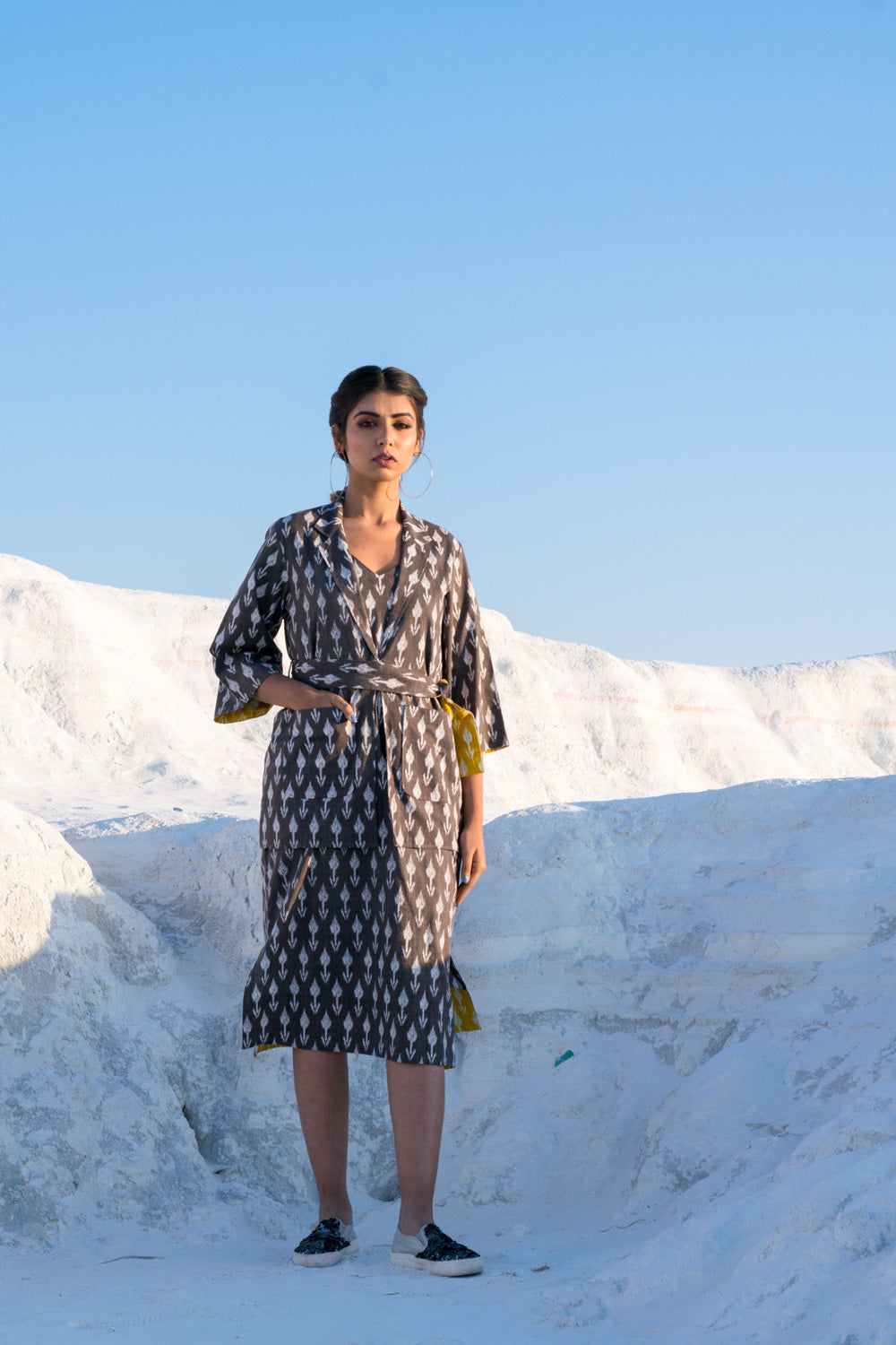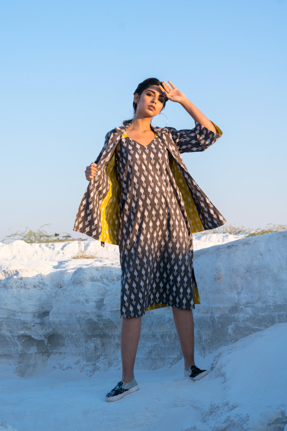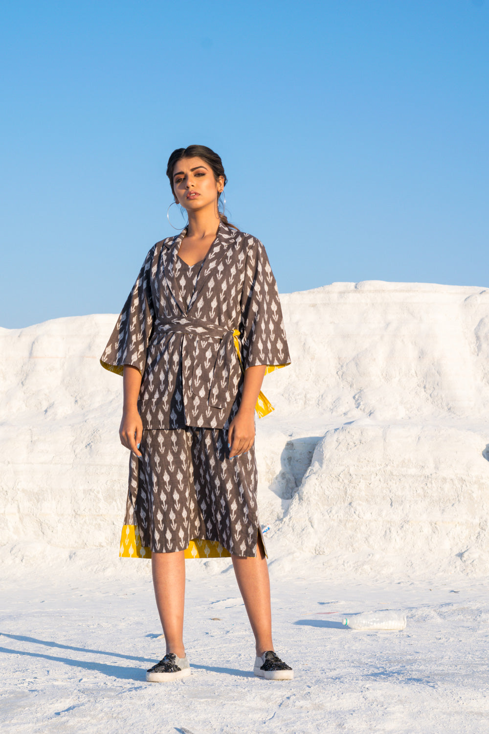 BLAZER – IS A STRAIGHT CUT IN GREY IKKAT WITH BELL SLEEVES AND A CONTRAST LINING IN YELLOW IKKAT