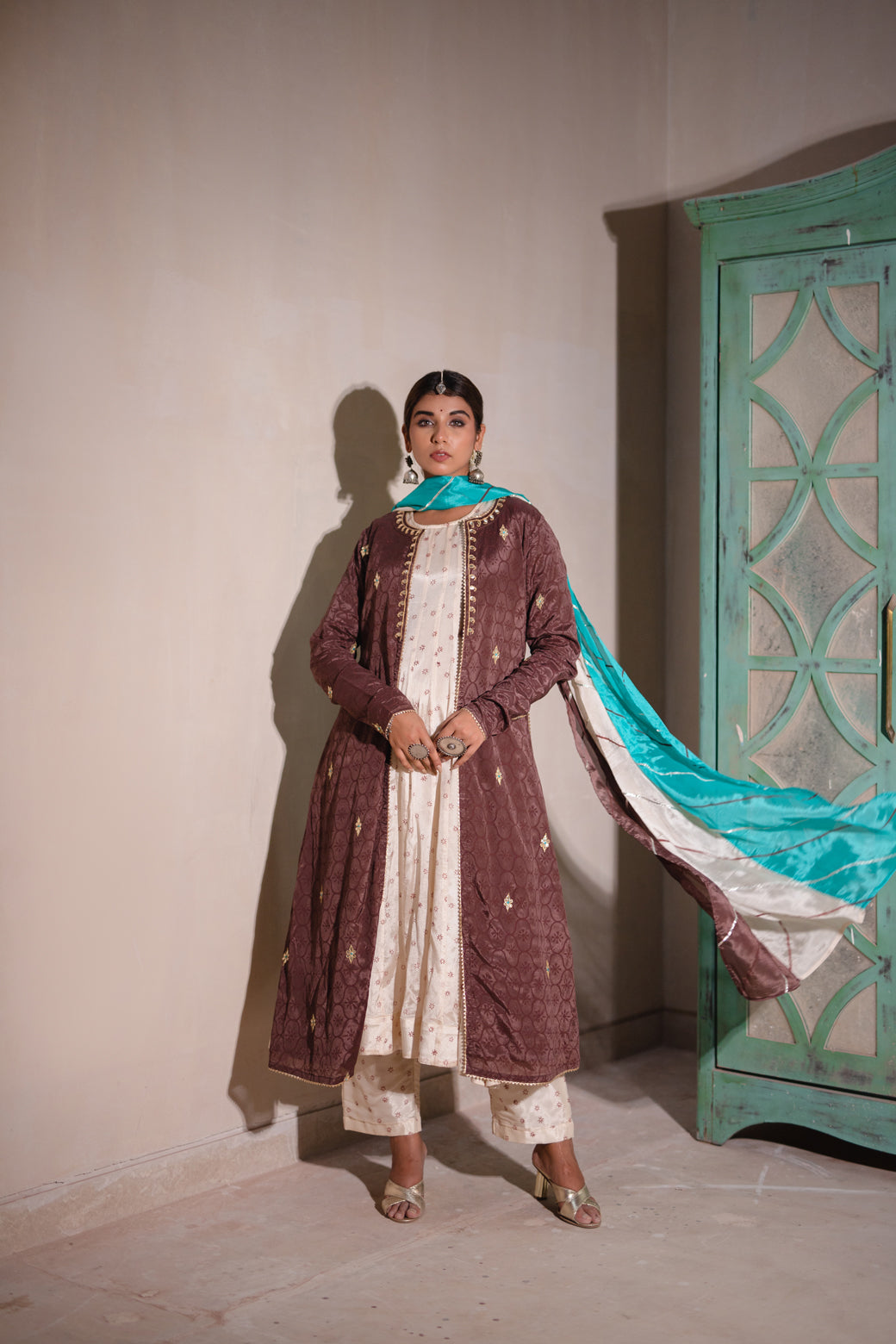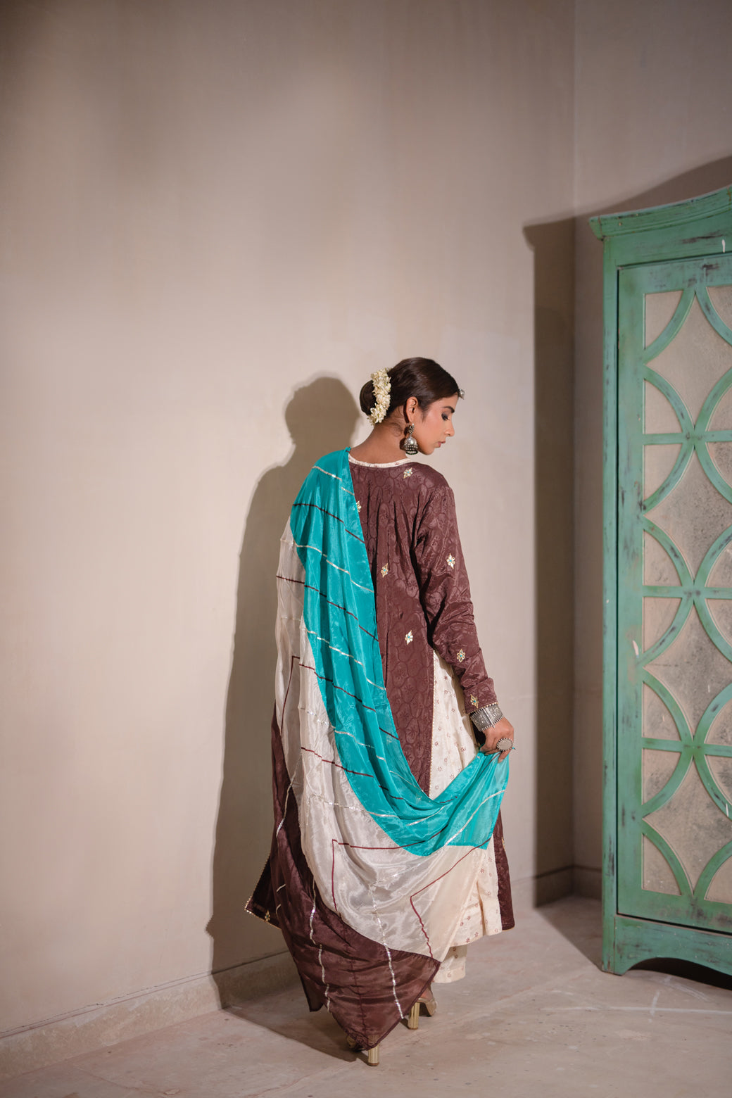 DELICATE GOTAPATTI MOTIFS (WITH A POP OF TURQUOISE THREAD WORK) & A LAYOUT ON THE JACKET NECK LINE – THAT CAN BE LEFT CLOSED OR OPEN TO MULTISTYLE THE LOOK.
