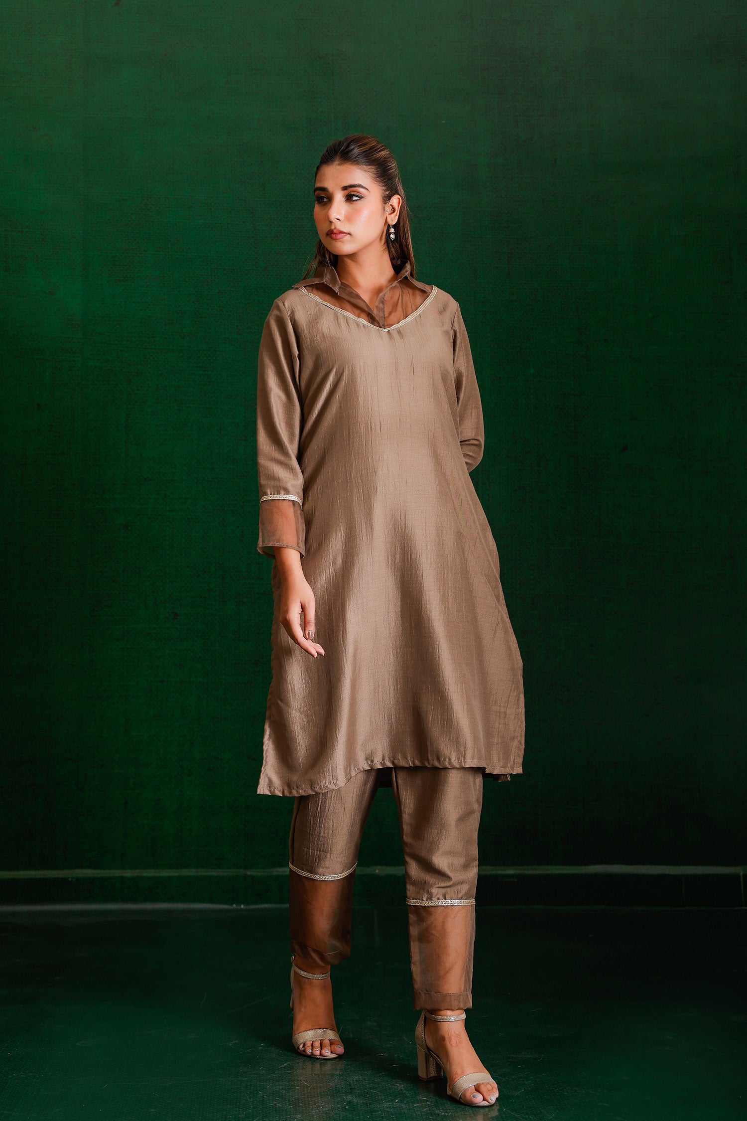 STYLE 1-WEAR JUST THE INNER BROWN CO-ORD SET WHICH HAS A LINE OF SEQUIN DETAILS