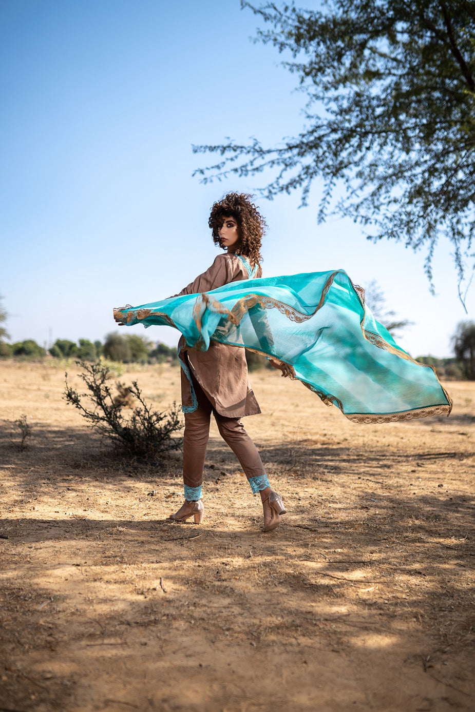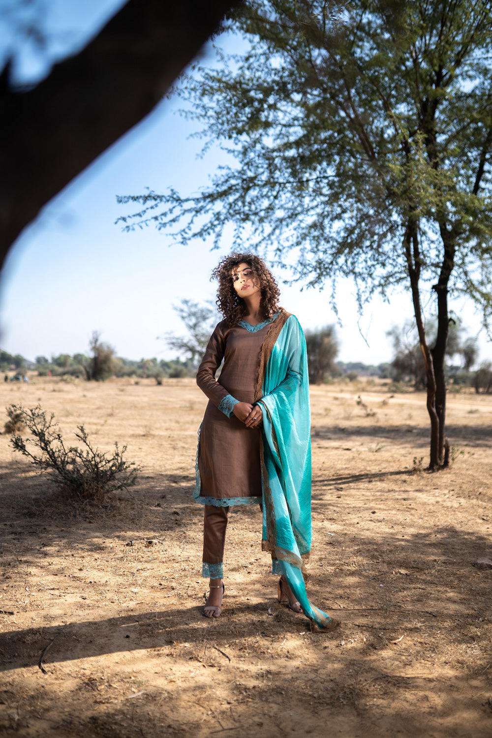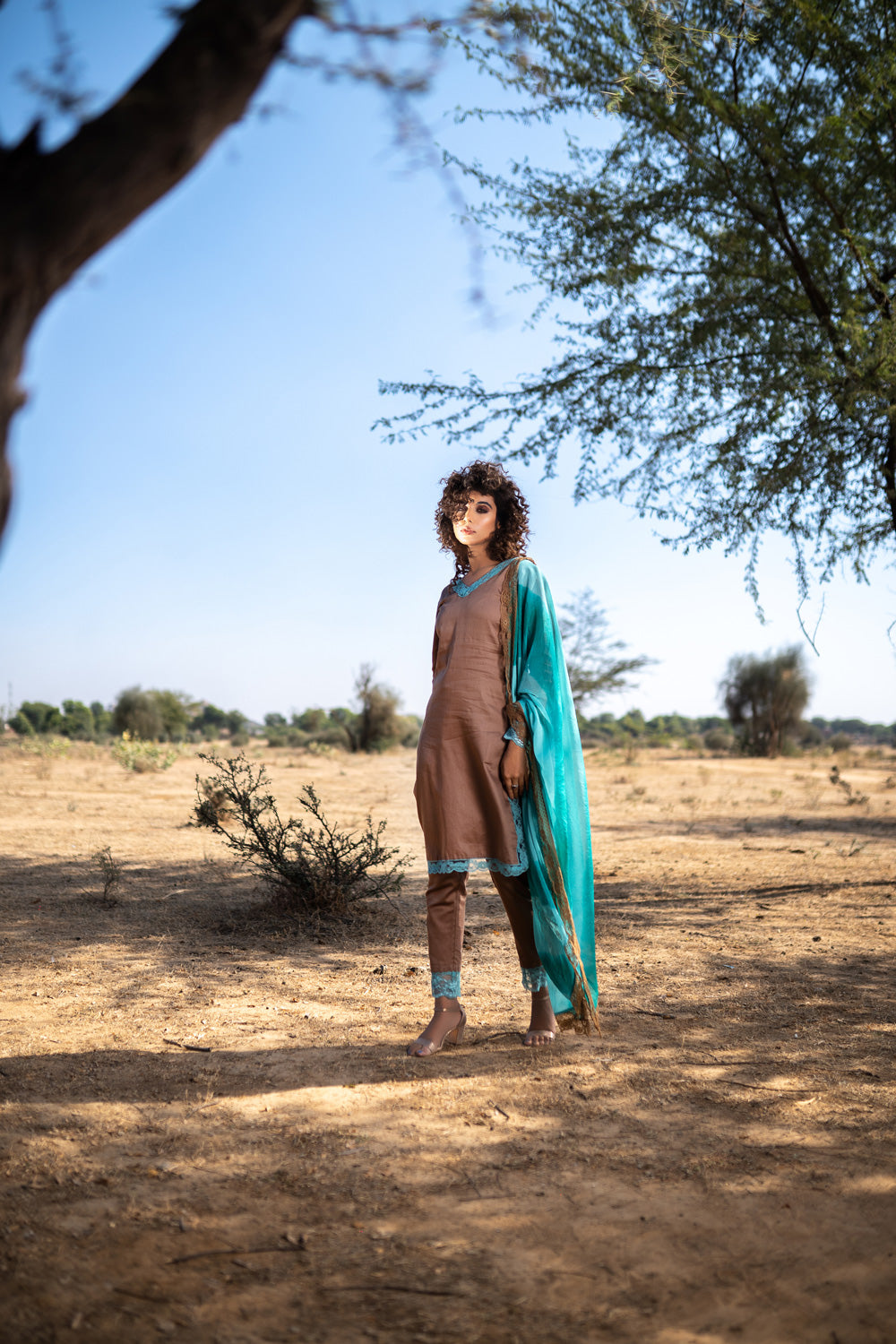 KURTA – STRAIGHT CUT WITH VINTAGE ‘V’ NECK (FRONT & BACK) , SLEEVES , PANTS DETAILED WITH LACED EGDES.