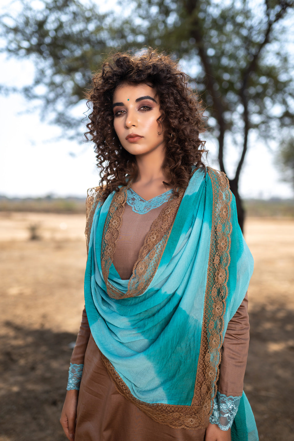 DUPATTA -CONTRAST SHADED DUPATTA IN DOUBLE ICY BLUE TONES & LACED EDGES ALL AROUND.