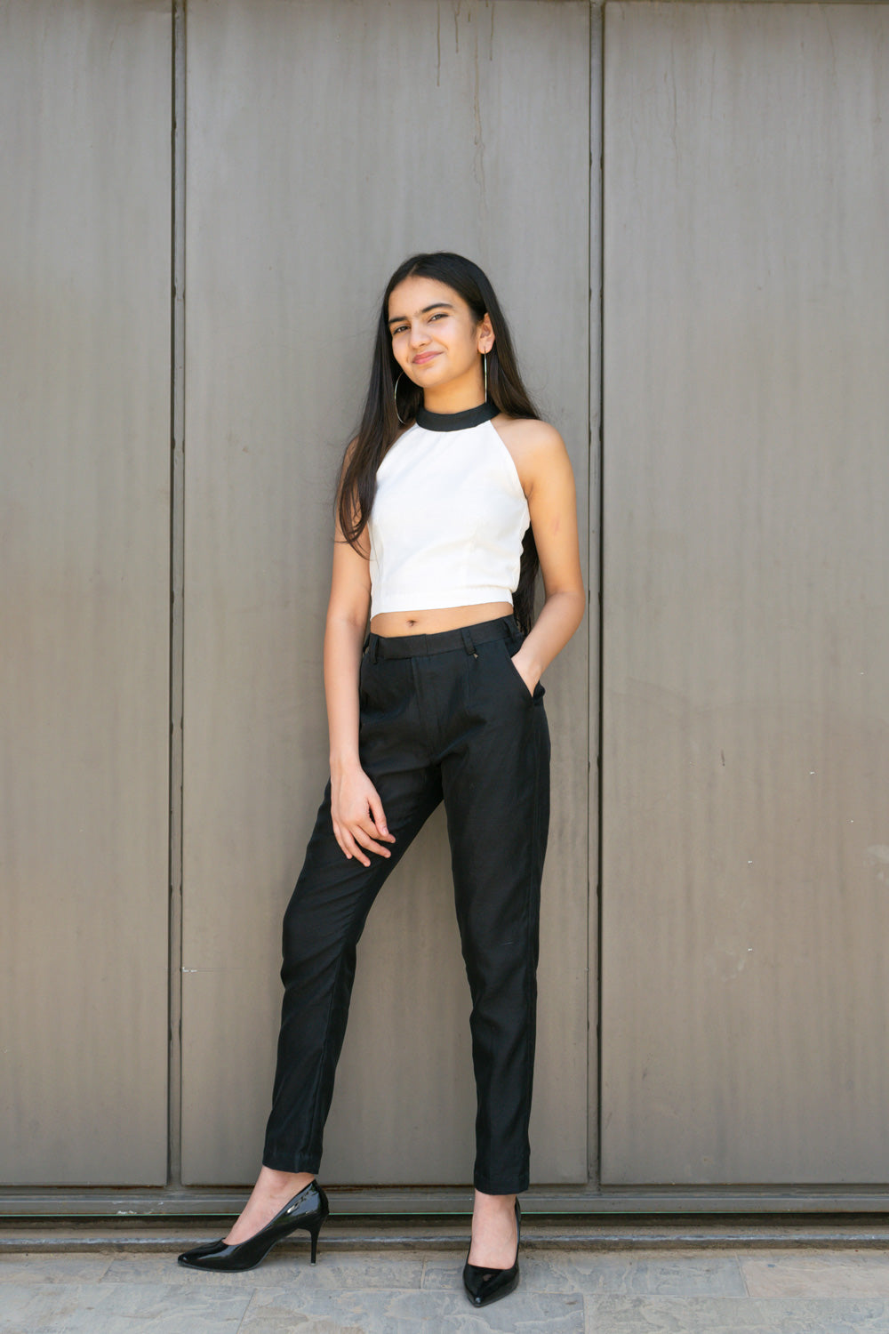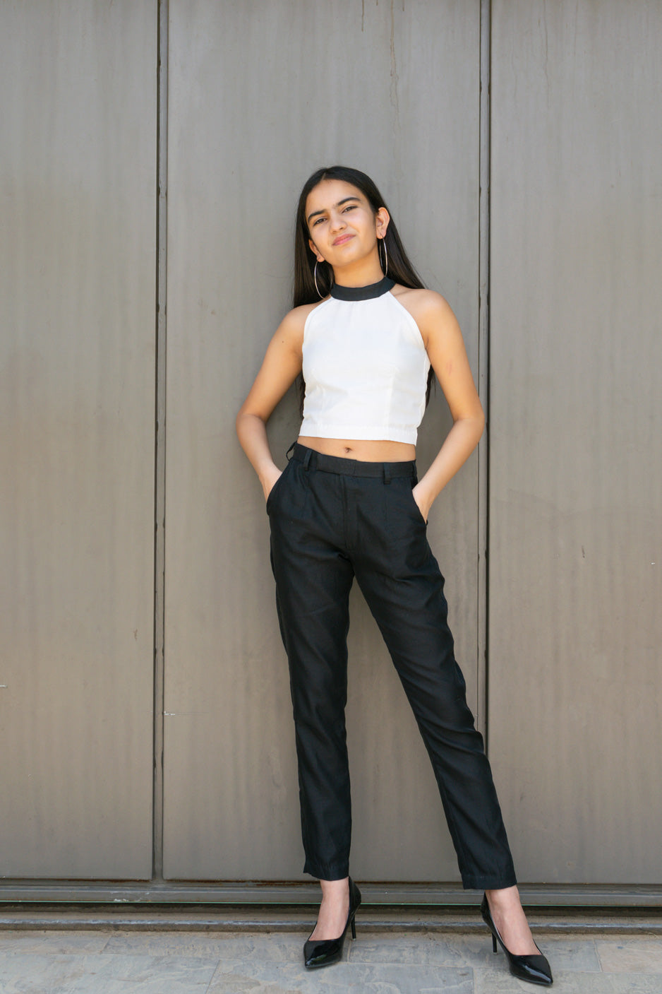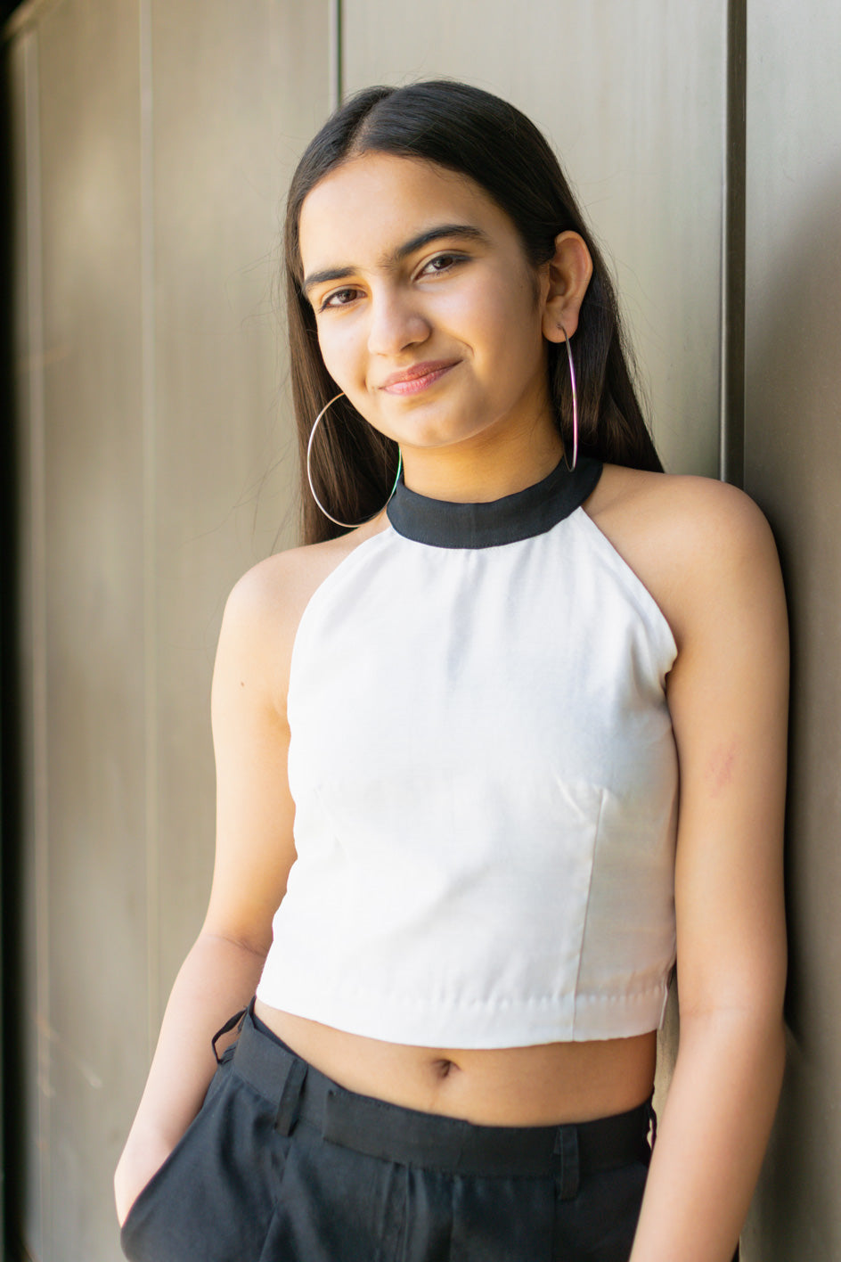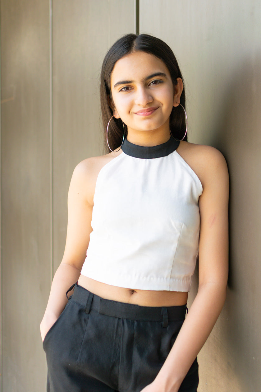 TOP – WHITE HALTER NECK WITH BLACK HIGH COLLAR AND A BACK ZIP FOR OPENING