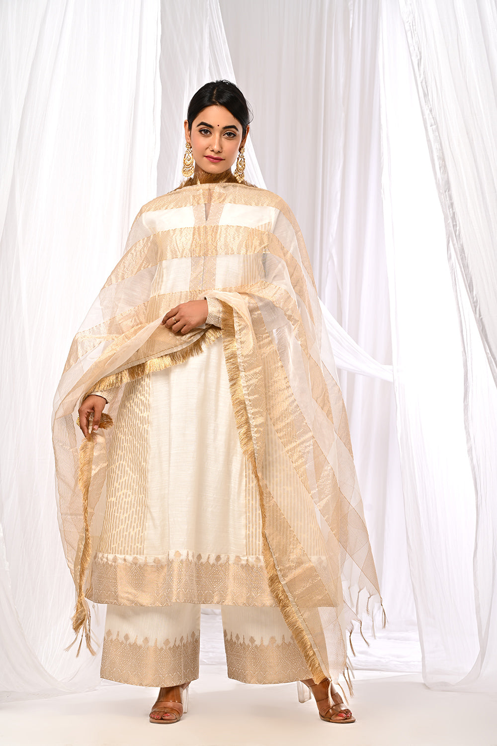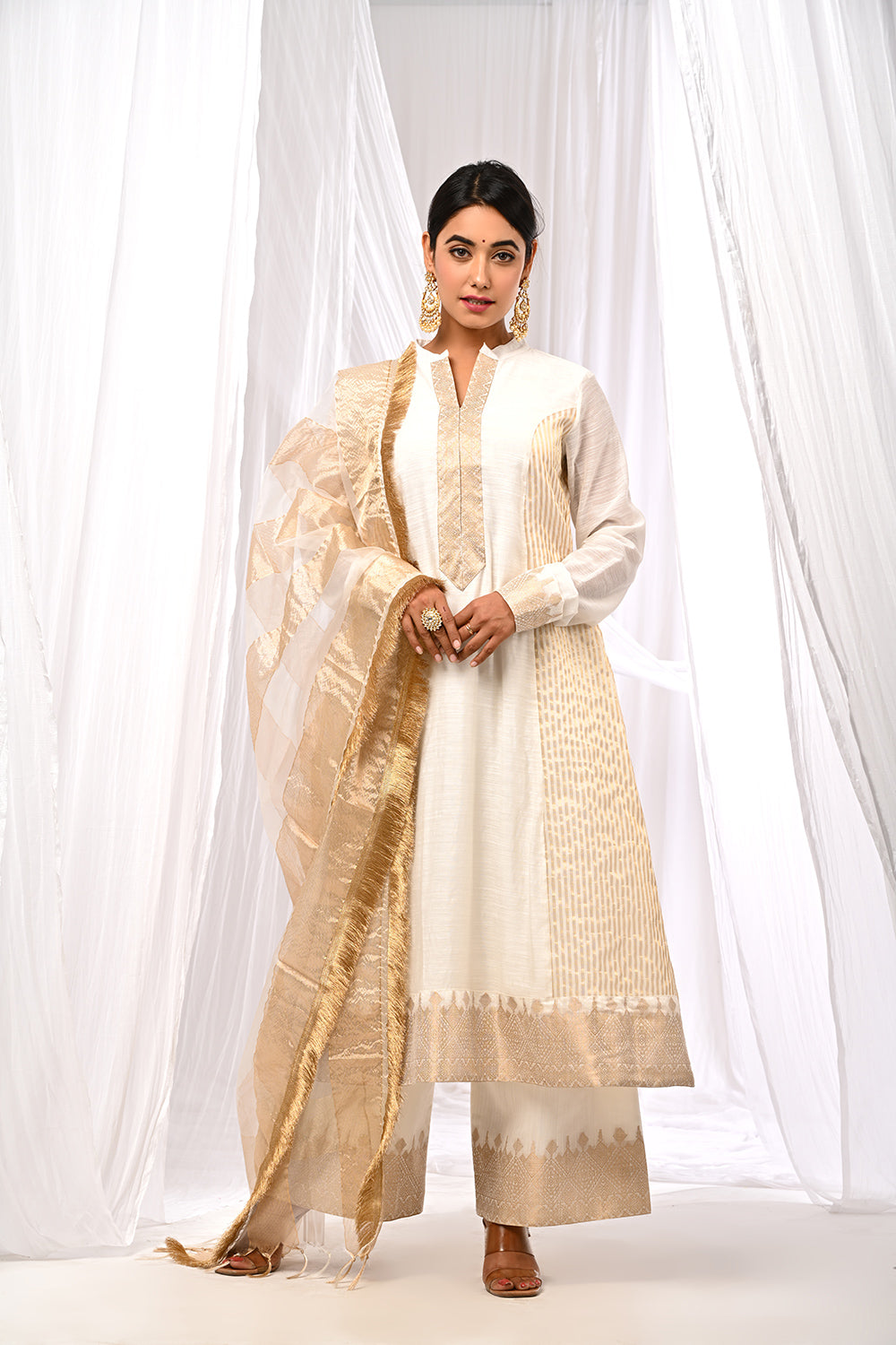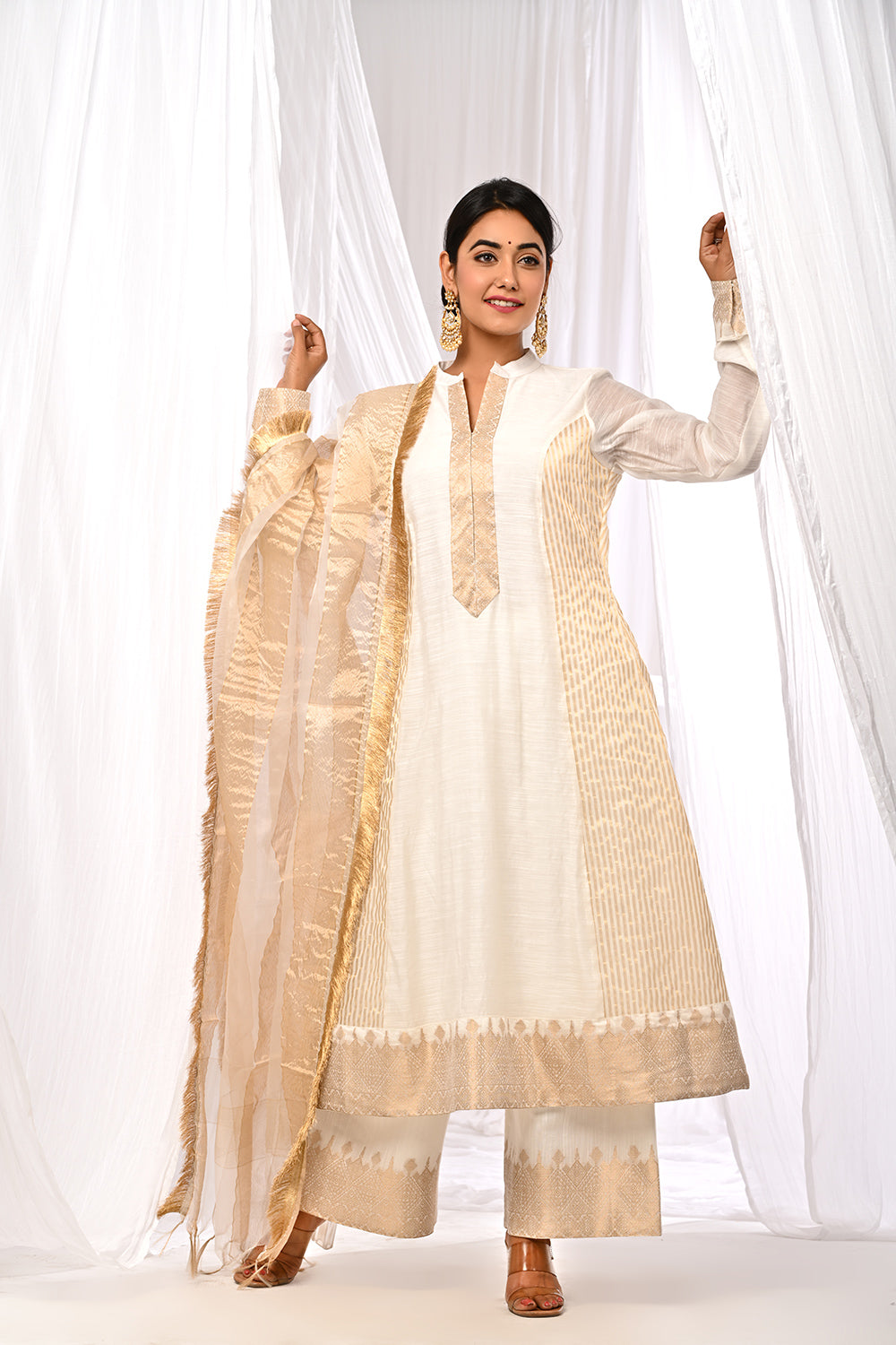 A MULTI PANEL OUTFIT IN OFFWHITE AND GOLD WITH DELICATE ZARI DETAILING.