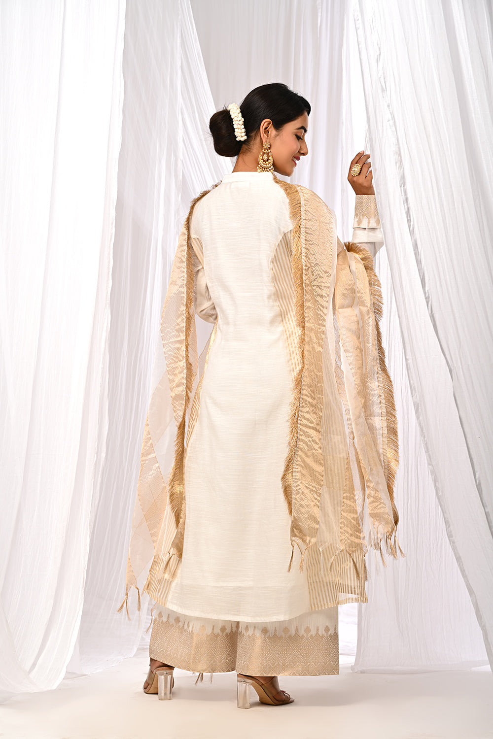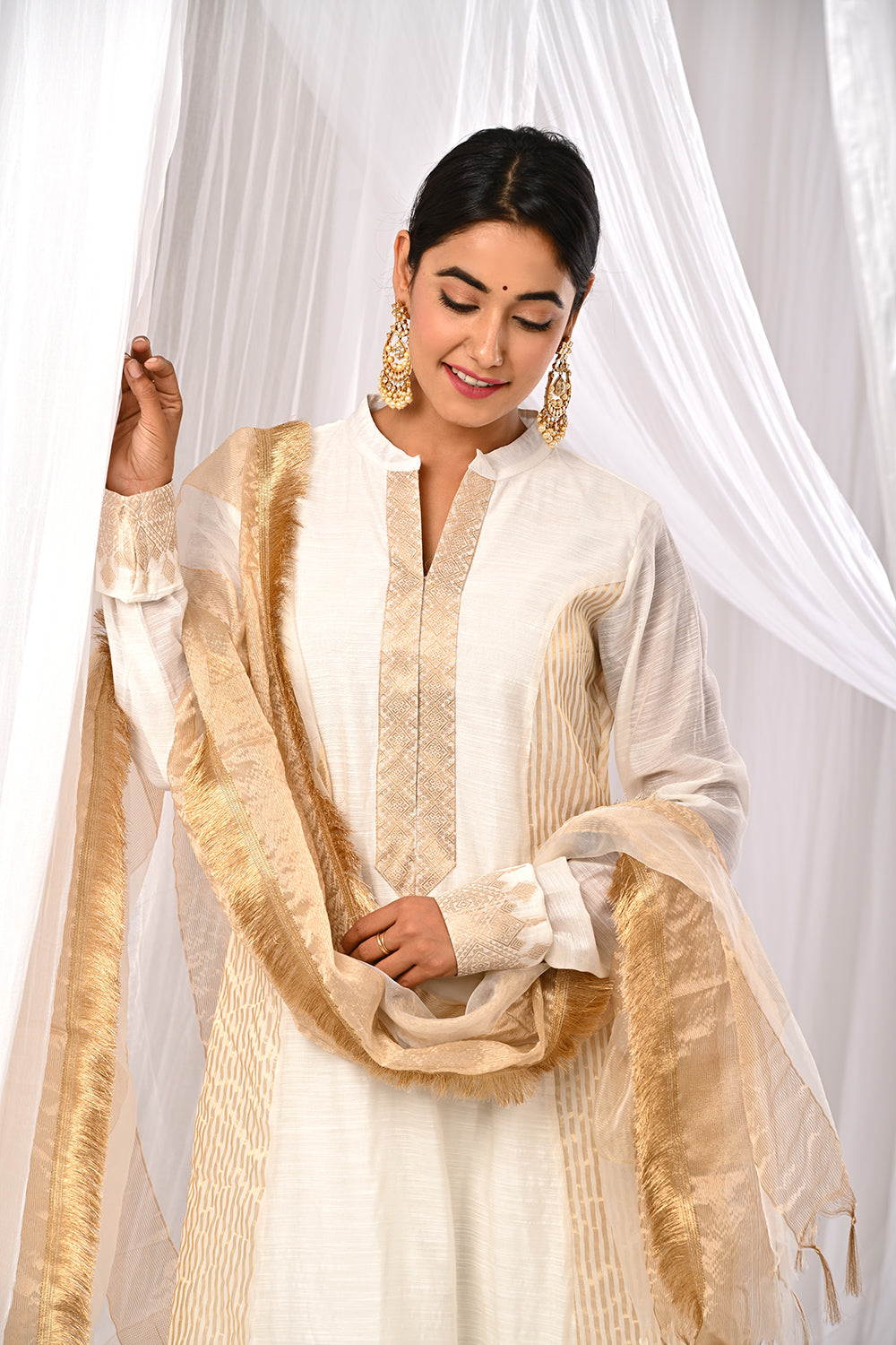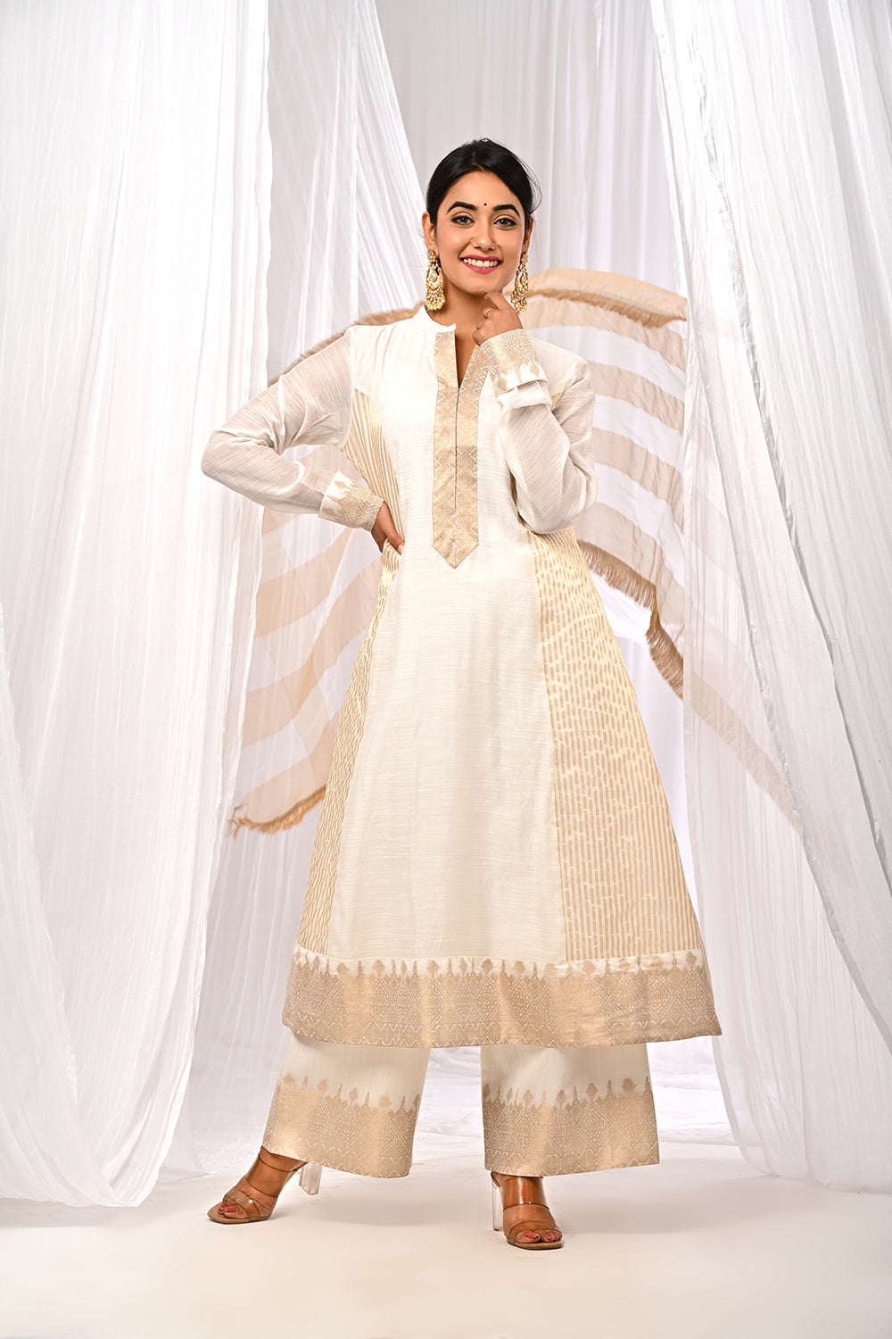 A MULTI PANEL OUTFIT IN OFFWHITE AND GOLD WITH DELICATE ZARI DETAILING.