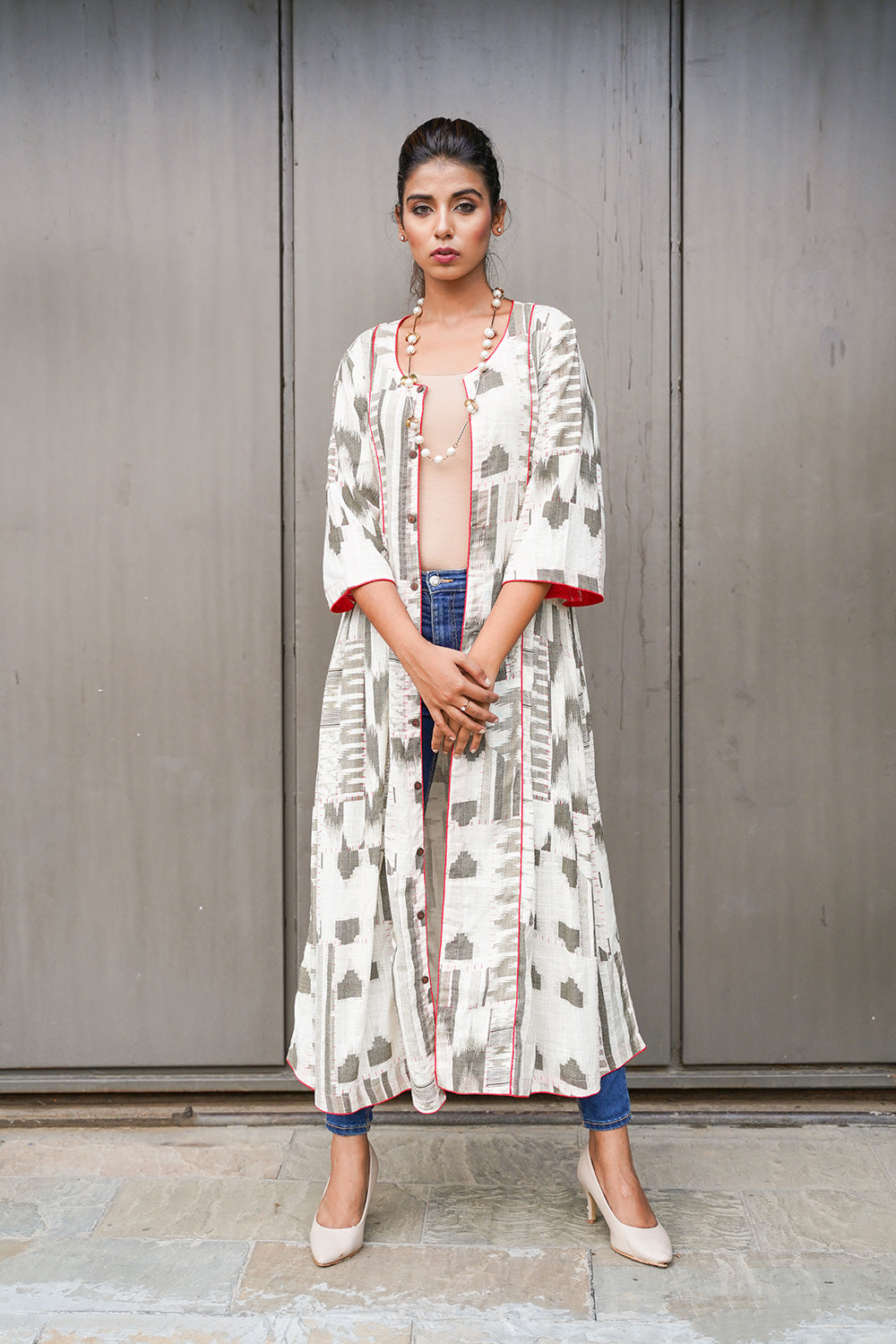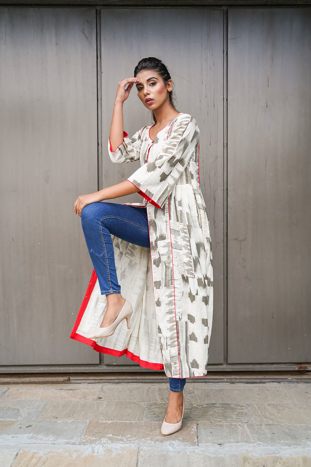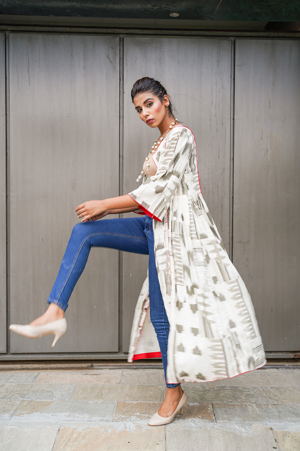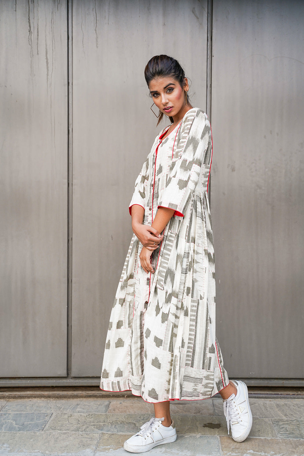 AN GEOMETRIC HAZE PRINT WITH SIDE PLEATES ,BELL SLEEVES AND CONTRAST BACKING CAN BE MULTI STYLED IN 3 DIFFERENT STYLES: