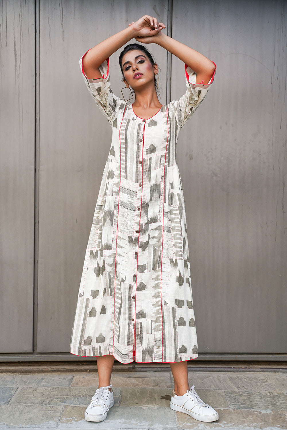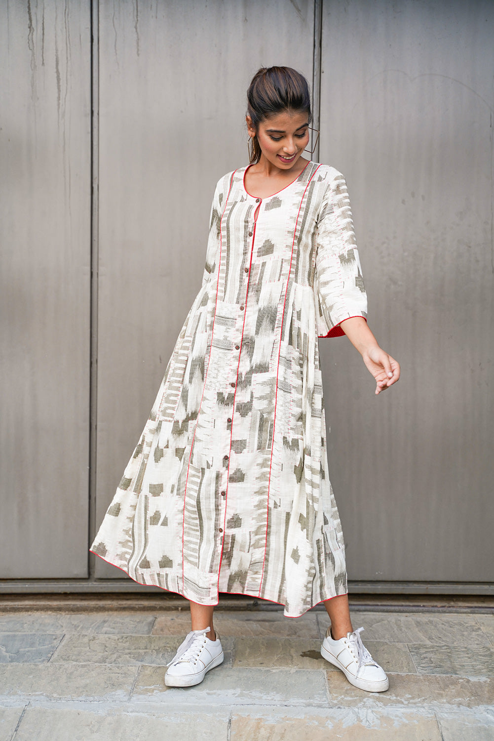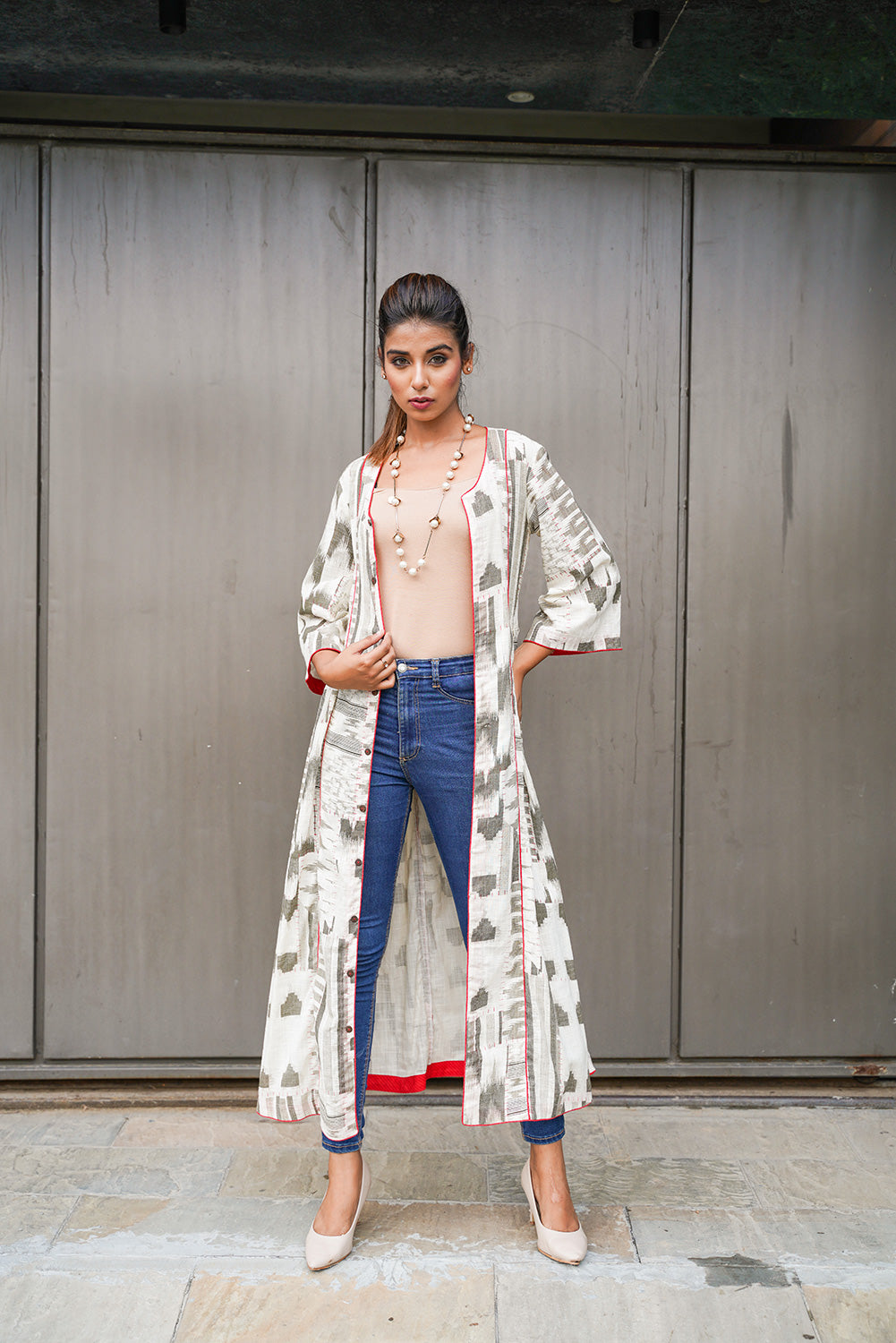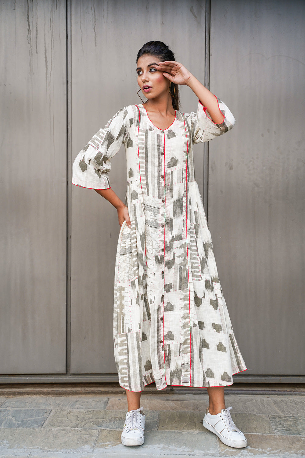 AN GEOMETRIC HAZE PRINT WITH SIDE PLEATES ,BELL SLEEVES AND CONTRAST BACKING CAN BE MULTI STYLED IN 3 DIFFERENT STYLES:
