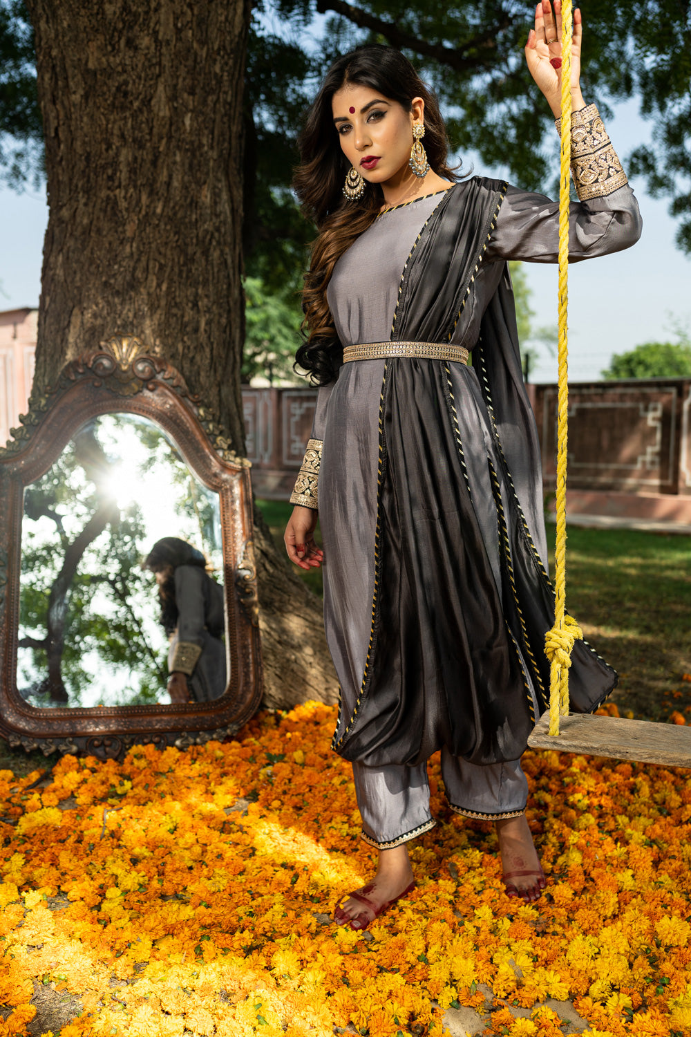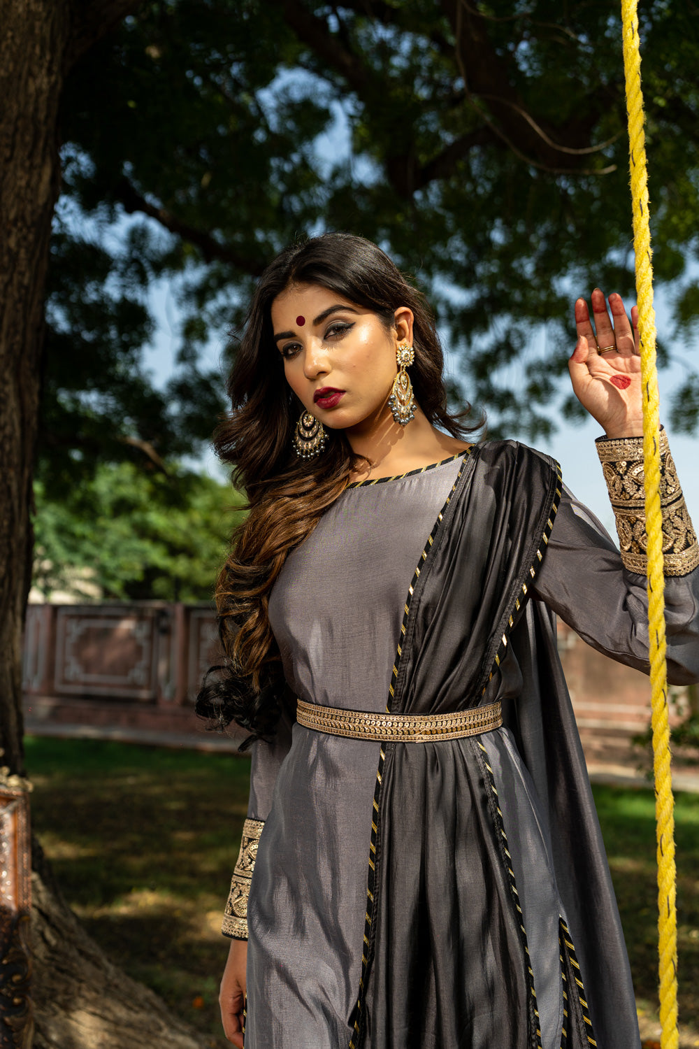 AN OUTFIT SET IN A DOUBLE TONED STEEL – GREY FABRIC, WITH A MULTI DRAPE DUPATTA & DETACHABLE BELT. THE ANTIQUE GOLD HANDWORK ON ITS SLEEVES, BELT & PALAZZO IS BREATHTAKING.