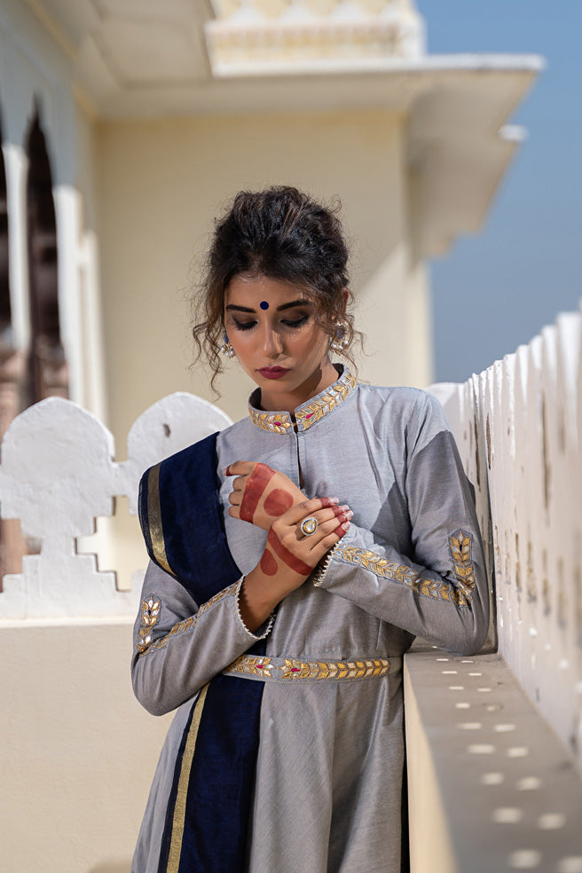 KURTA – A ROYAL PIECE SET IN THE TONES OF VINTAGE GREY WITH GOLD / SILVER GOTA PATTI WORK AND BLUE/PINK THREAD WORK.
