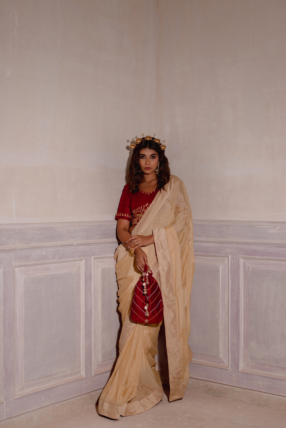 A CLASSIC, EVERGREEN CREAM SAREE WITH DOUBLE TONED GOTAPATT WORK.