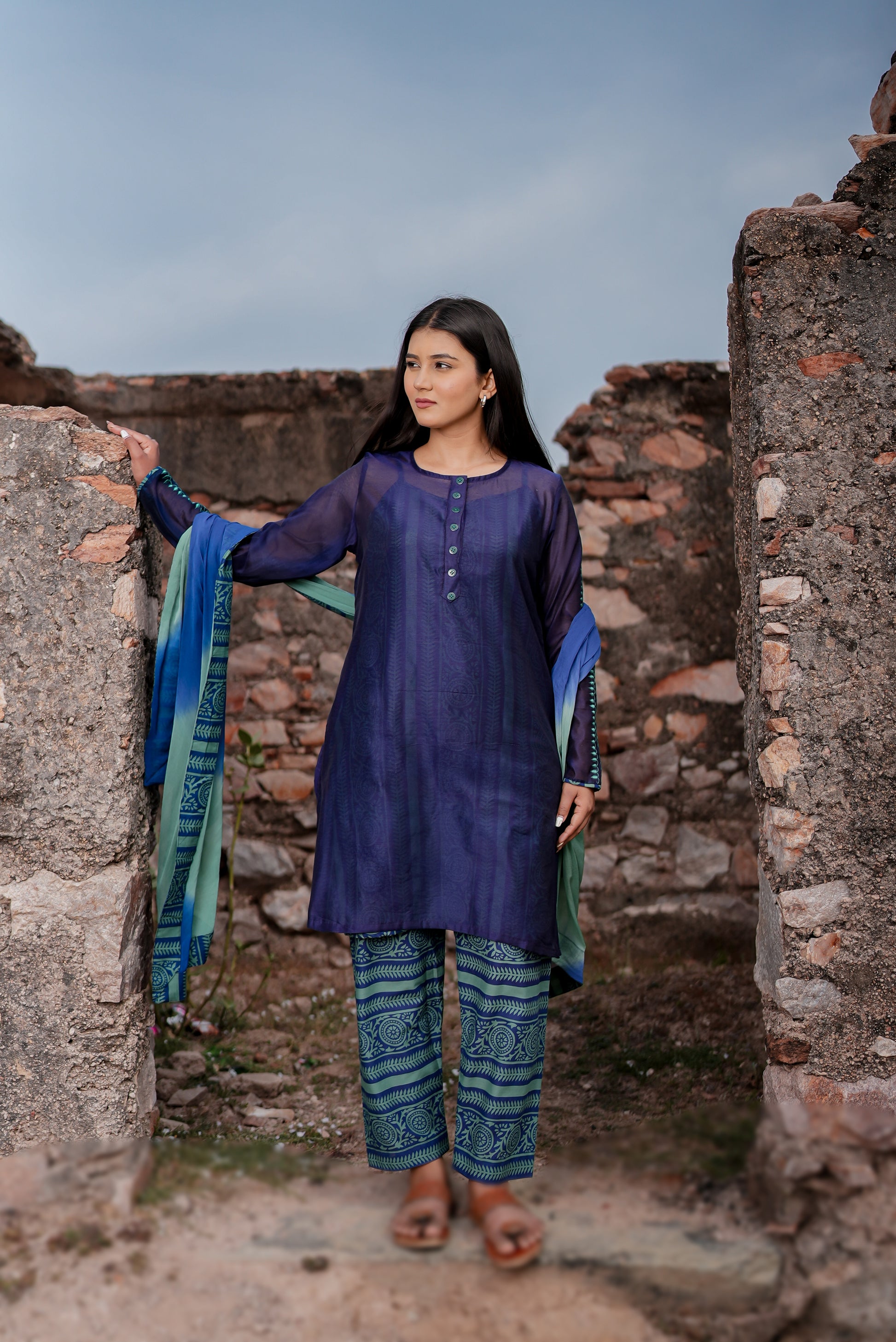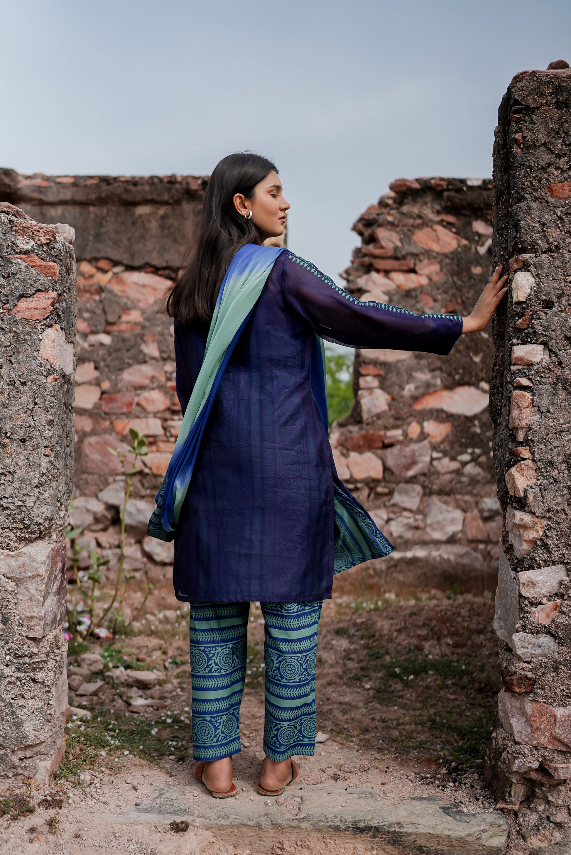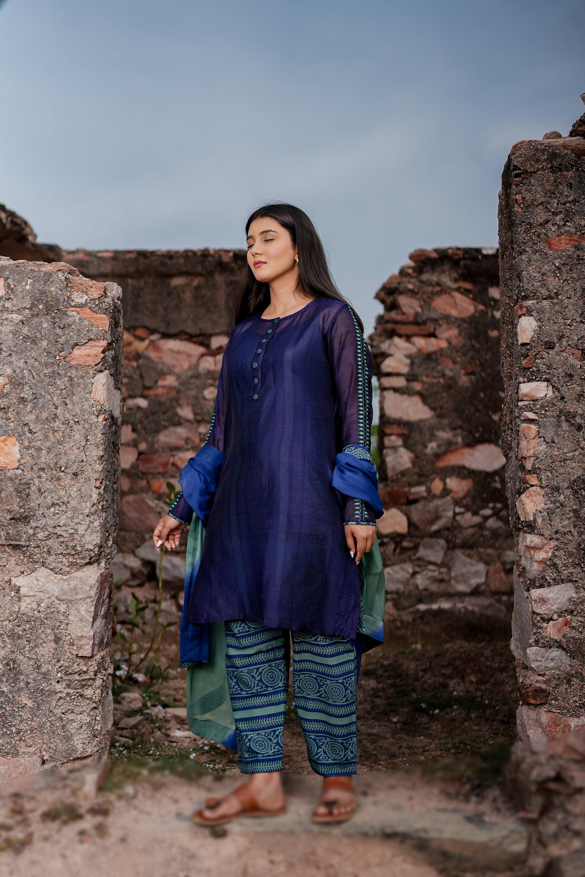 OUTER KURTA - NAVY CHANDERI WITH TEAL HAND EMBROIDERY