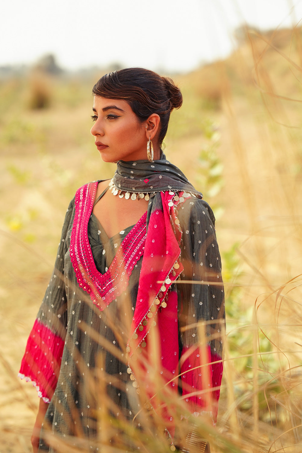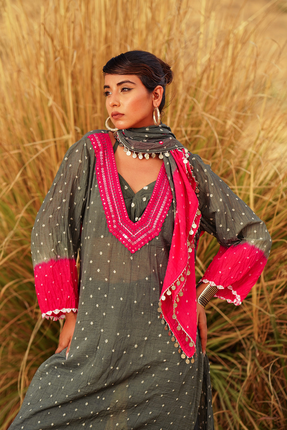 THIS IS A 4 PIECE SET – A BOHEMIAN EMBELLISHED KURTA, JAAM COTTON PANT, A SCARF AND A TIE UP INNER.