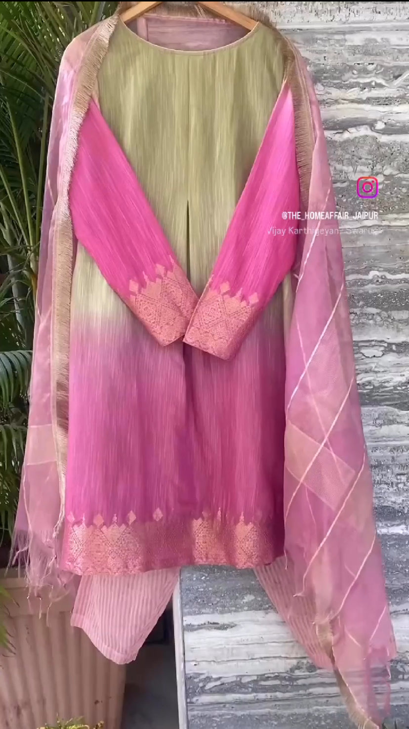 AN INTERESTING SILHOUTTE CRAFTED IN SHADED PINKGREEN WITH DELICATE ZARI DETAILING AND A PASTEL PINK STRIPED HANDLOOM DUPATTA.