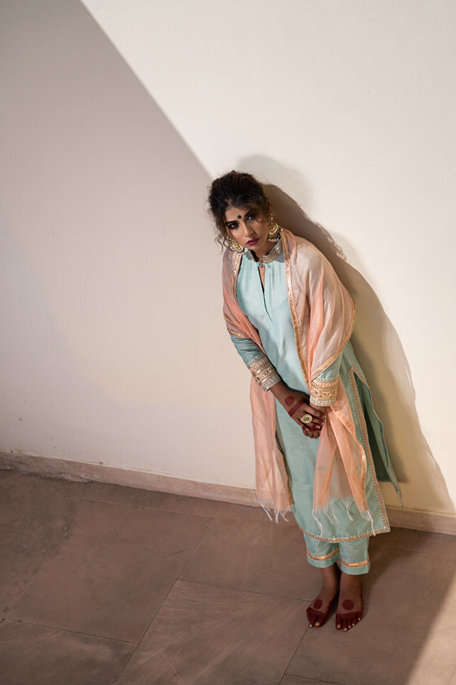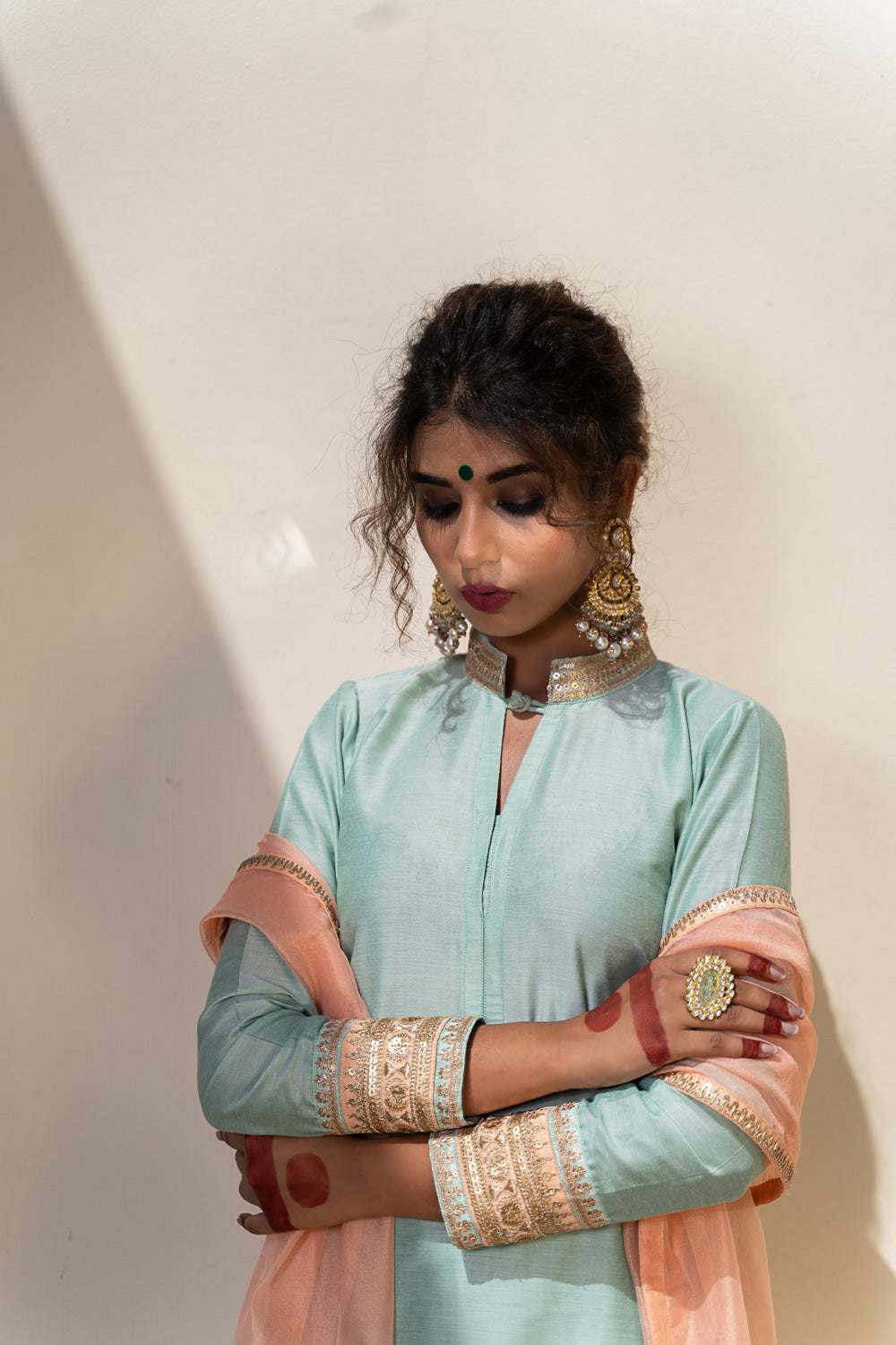 KURTA – STRAIGHT CUT WITH MANDARIN COLLAR, SLEEVE EDGE, SLITS HIGHLIGHTED WITH INTRICATE ANTIQUE GOLD WORK.