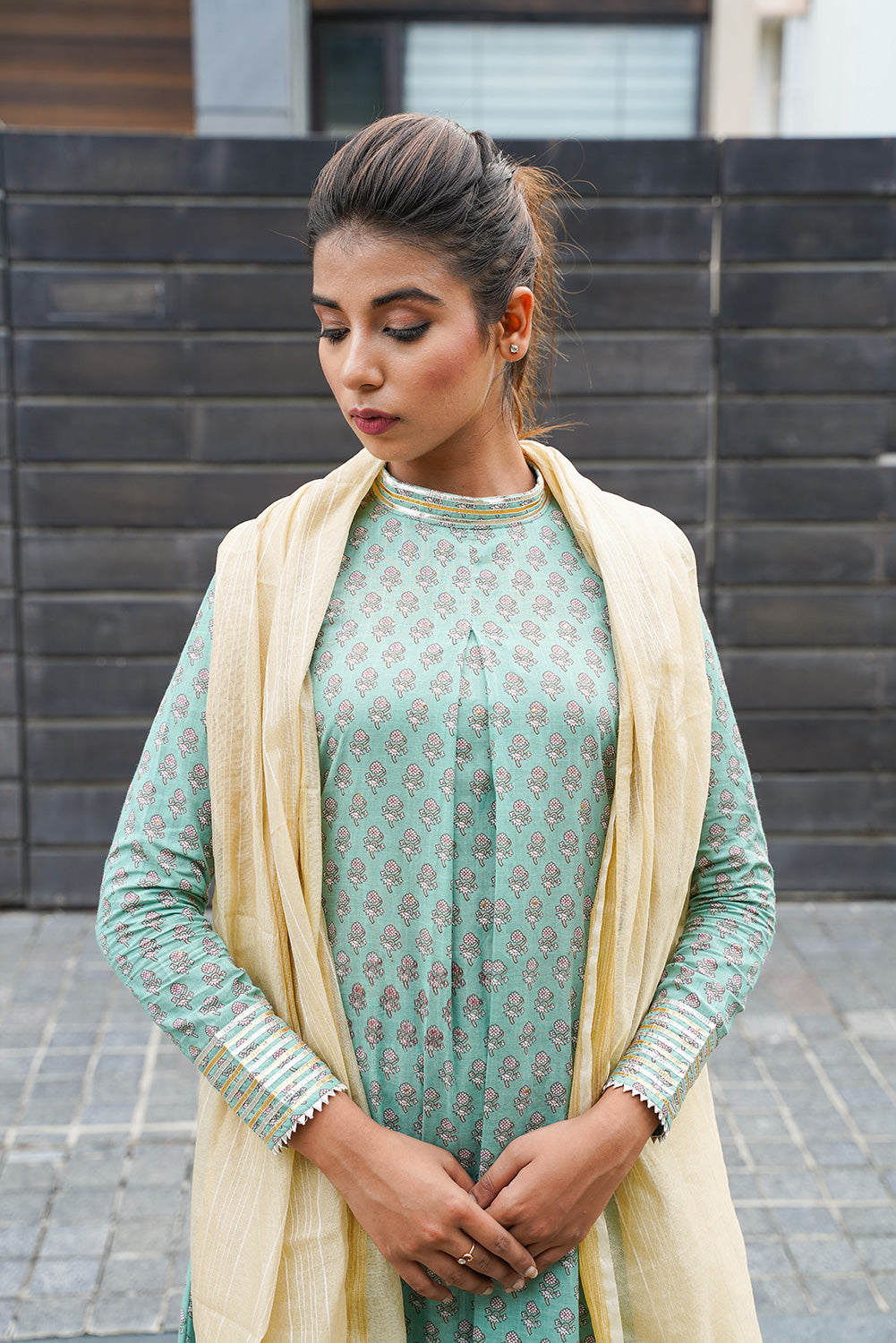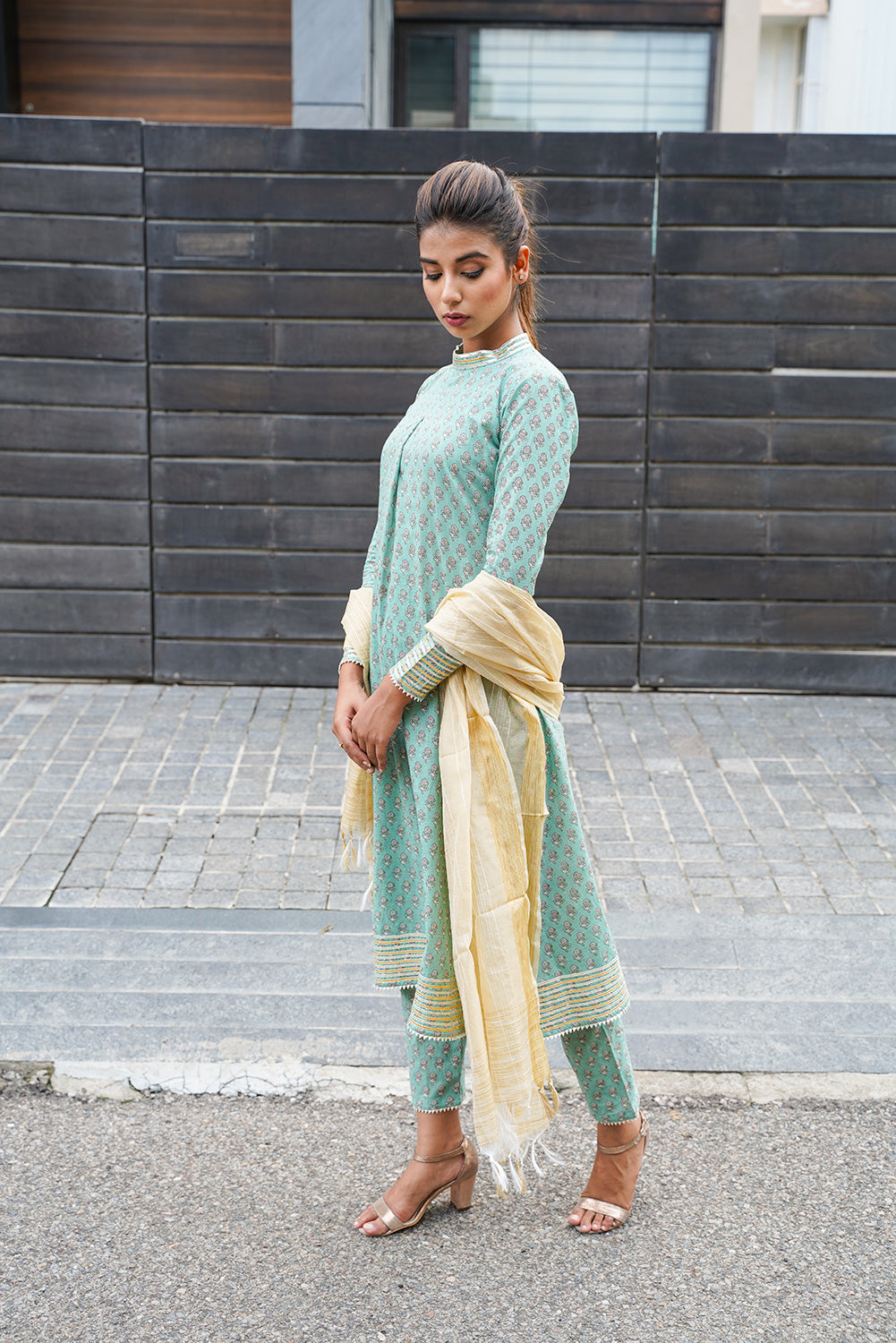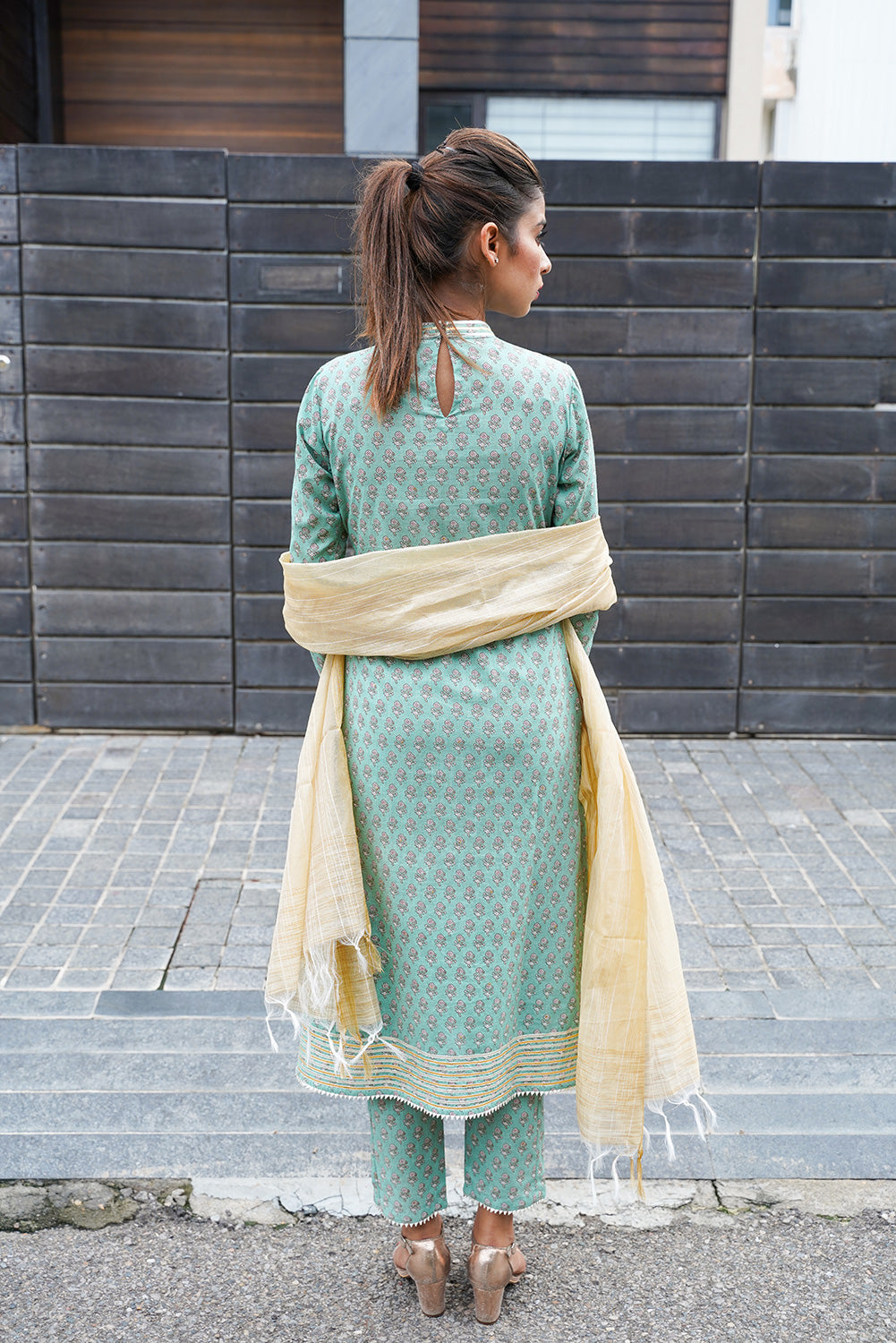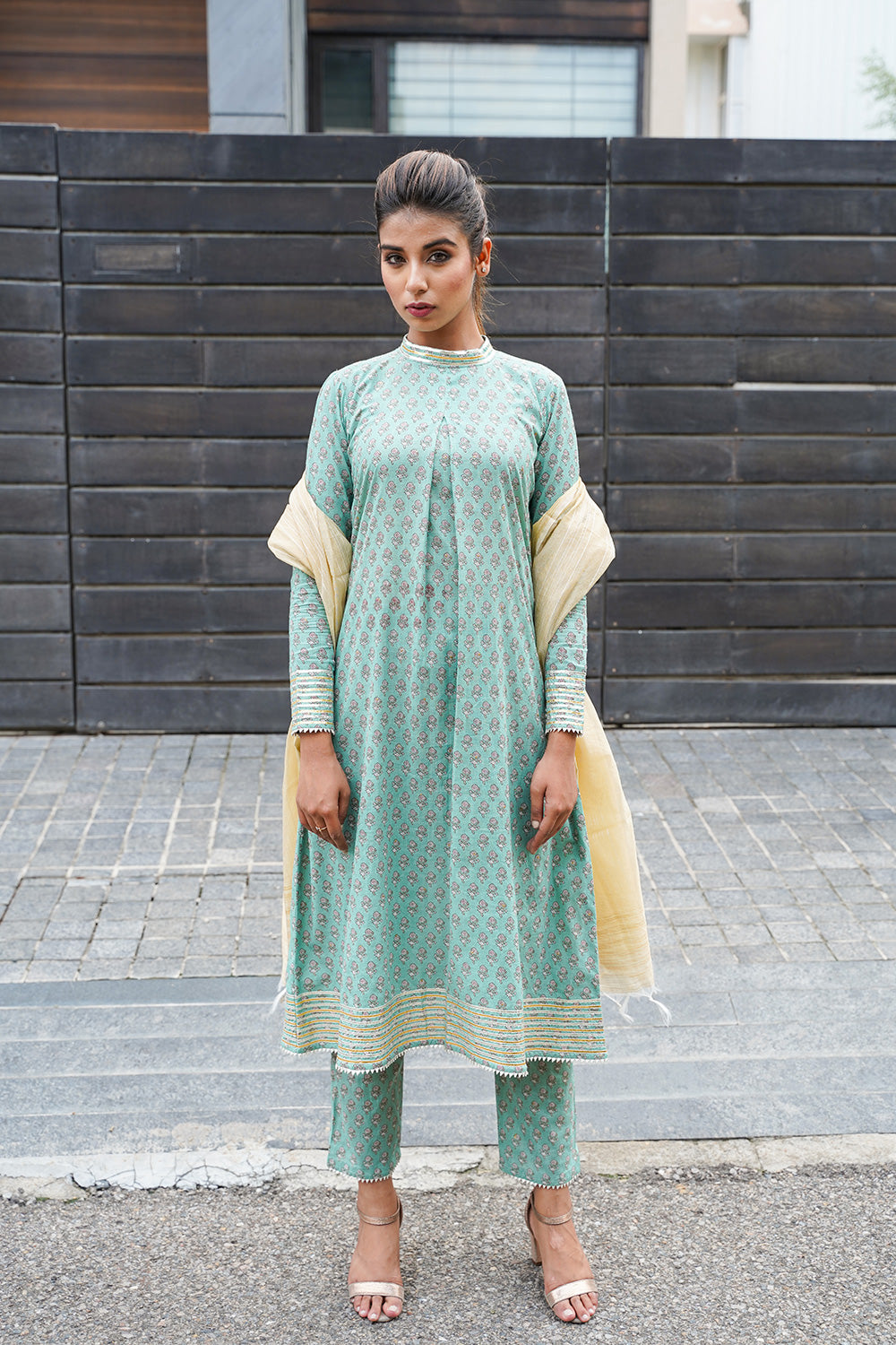 PANTS – STRAIGHT CUT WITH ELASTICATED WAIST AND GOTA TRIMS AT THE EDGE.