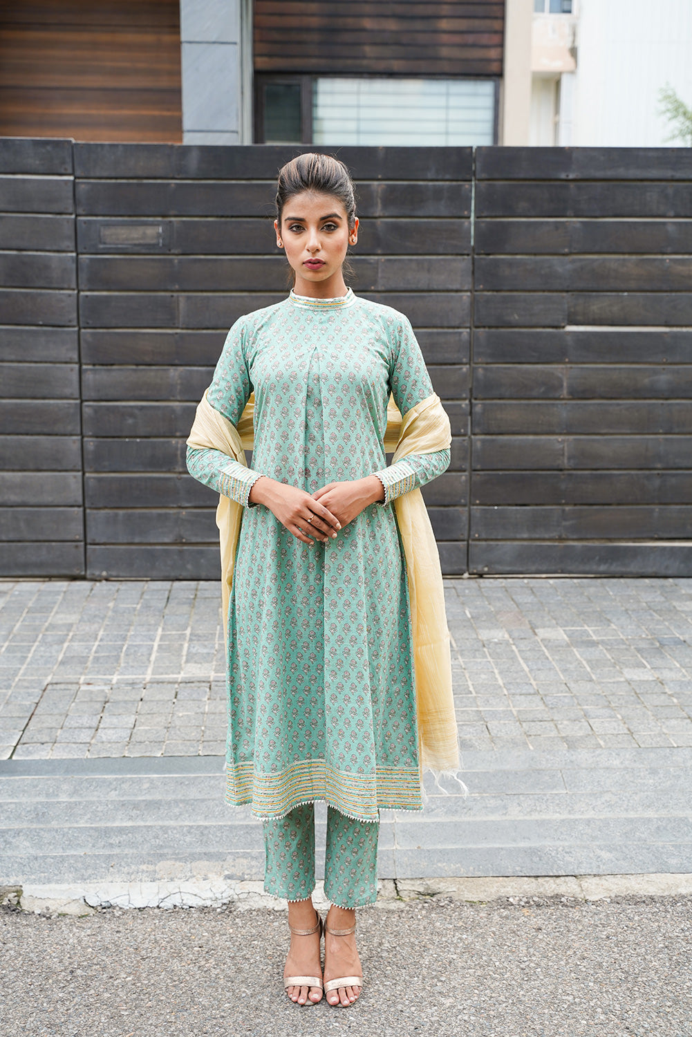 KURTA – AN ‘A’ LINE CUT WITH COLLAR, SLEEVES & FLAIR HIGHLIGHTED BY LINES OF GOLD AND SILVER GOTA ALTERNATIVELY.
