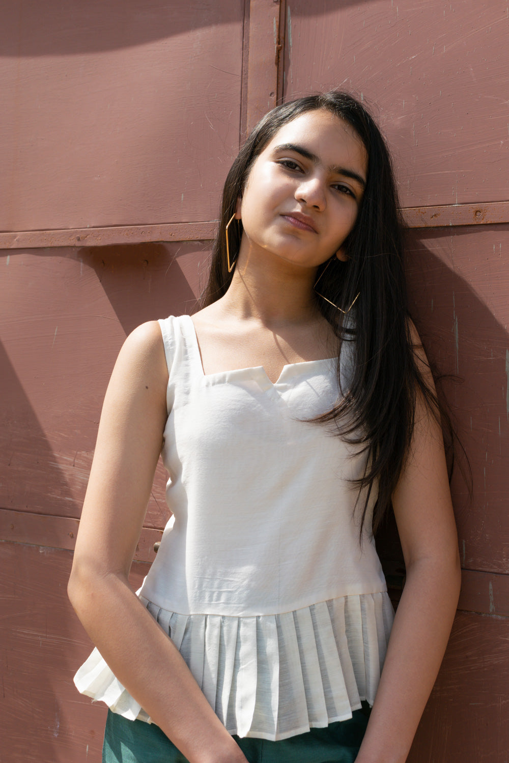 TOP – OFFWHITE STRAIGHT CUT WITH SHOULDER STRAPS AND PLEATES AT THE END OF ITS LENGTH