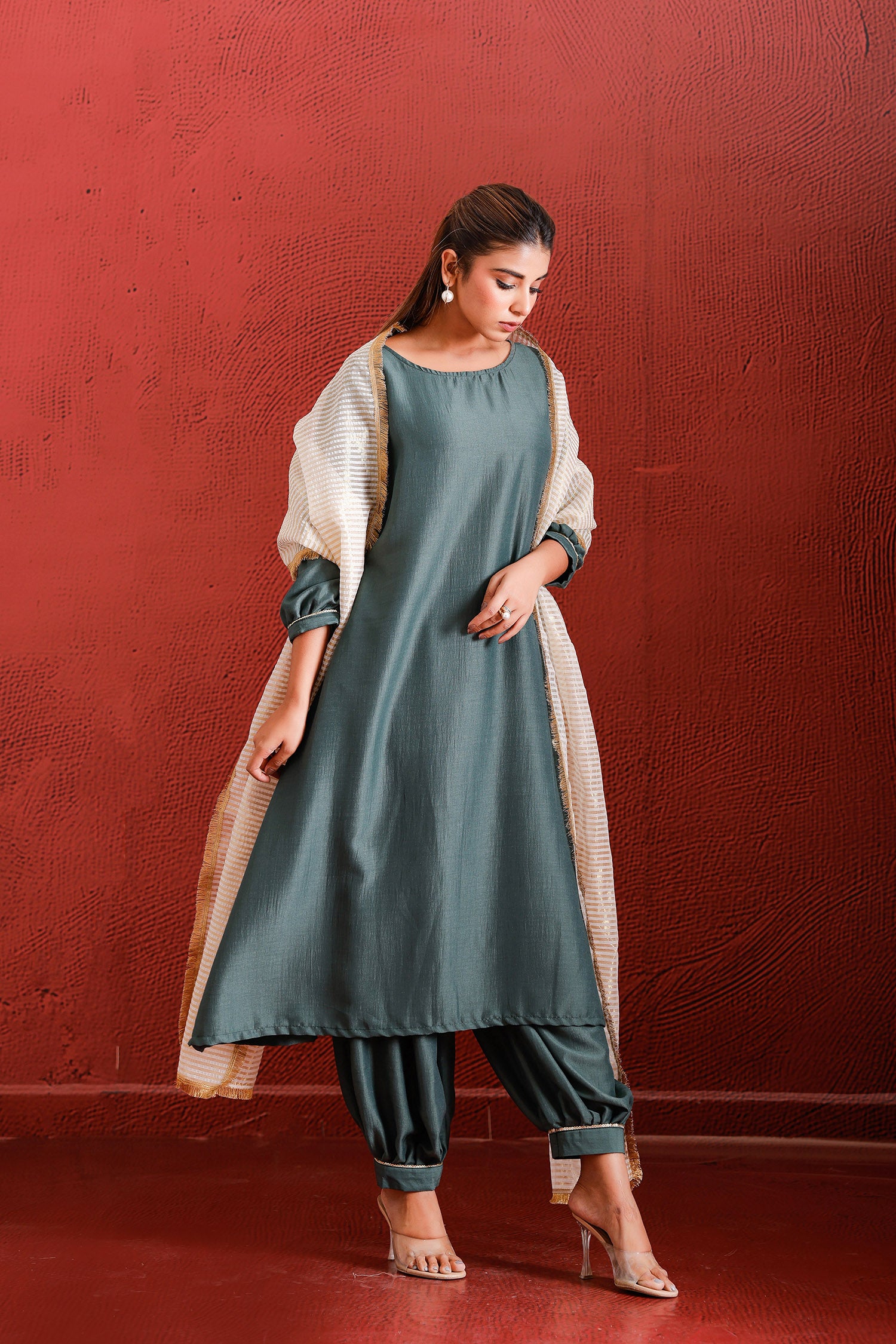 AN A LINE TEAL SUIT WITH POCKETS, SEQUIN LINED – PLEATED SLEEEVS & PANTS.
