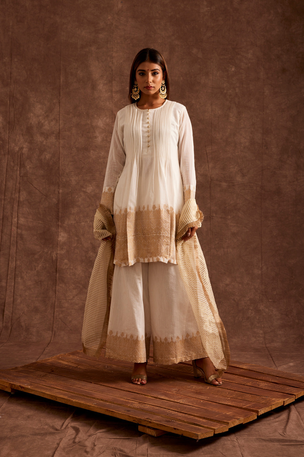 THIS PINTEXED, PLEATED KURTA WITH FLAIRED PALAZZOS COMES WITH A STRIKING STRIPED DUPATTA.