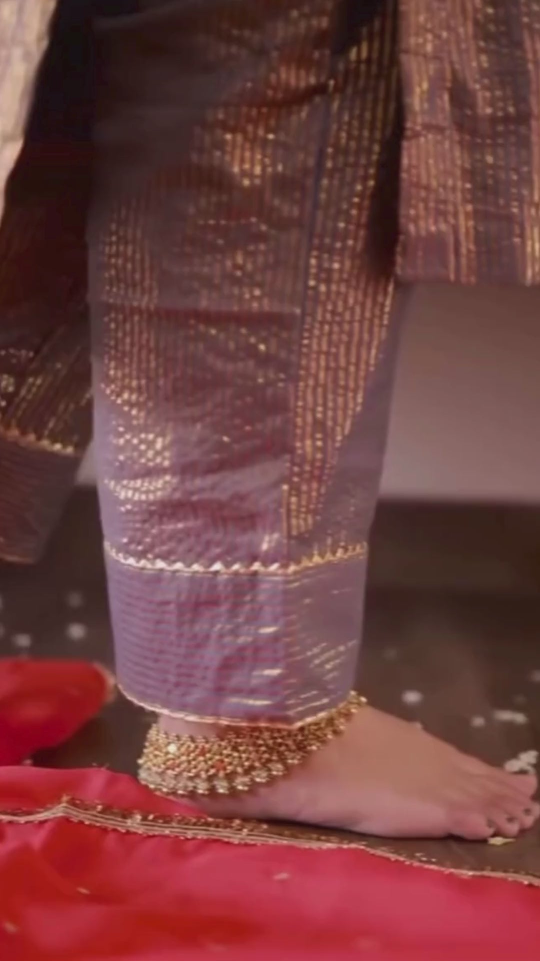 A BUTTER SOFT VINTAGE REGAL SET IN SILVER, GREY AND RED IN PURE HANDLOOM CHANDERI WITH A CHIFFON DUPATTA.
