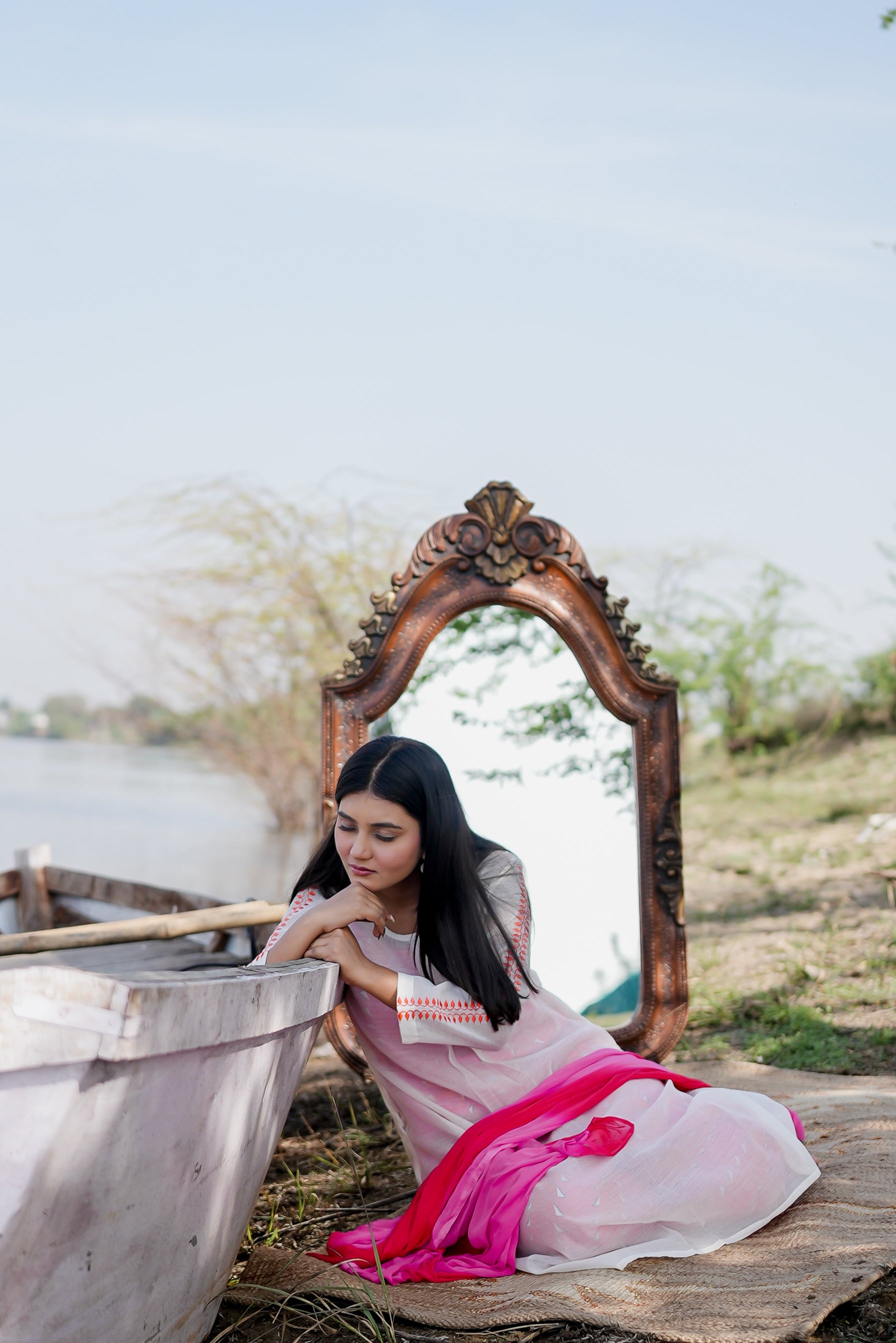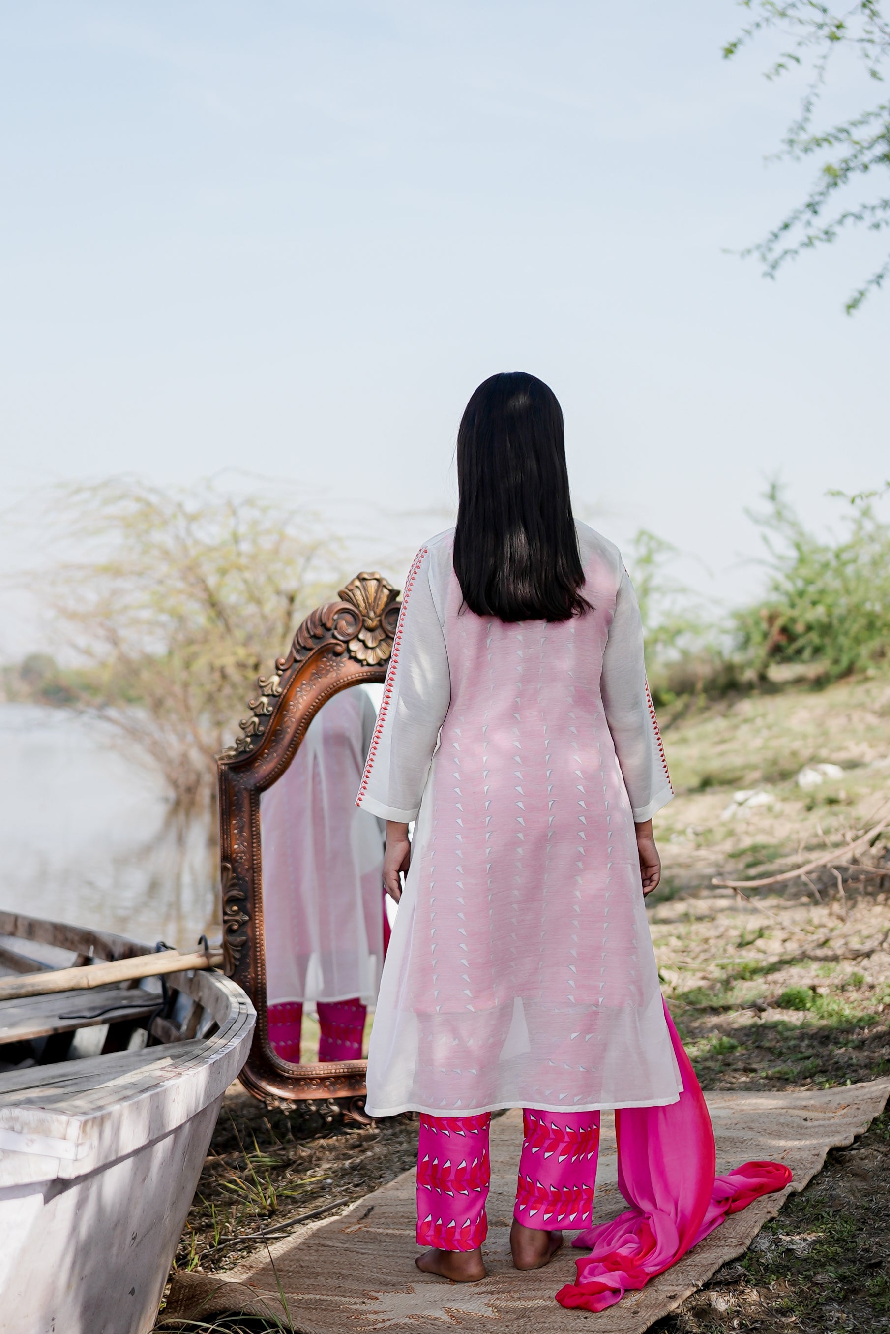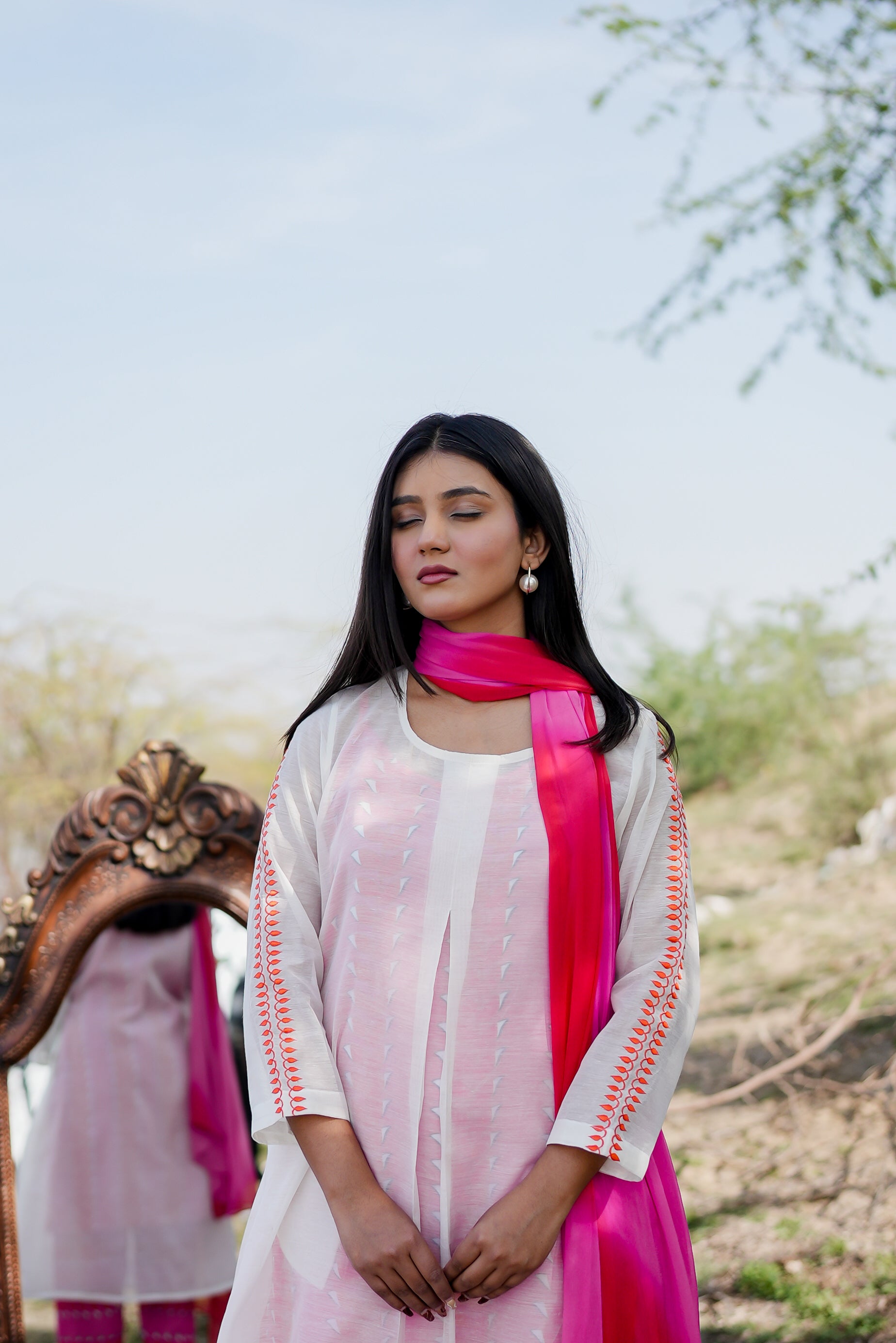 OUTER KURTA - WHITE CHANDERI WITH RUST HAND EMBROIDERY